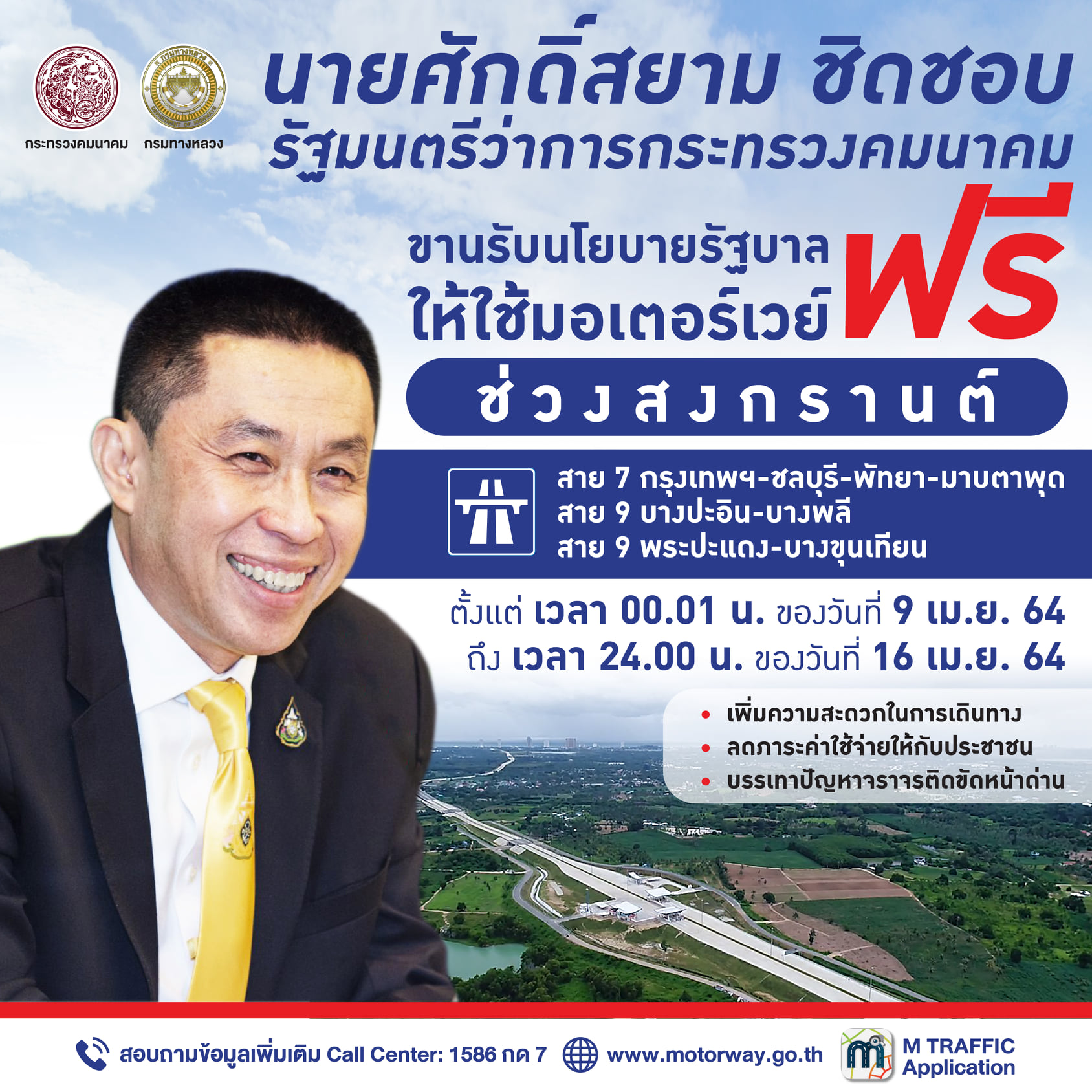 กรมทางหลวง กระทรวงคมนาคม ขานรับนโยบายรัฐบาลให้ใช้มอเตอร์เวย์ฟรีช่วงสงกรานต์