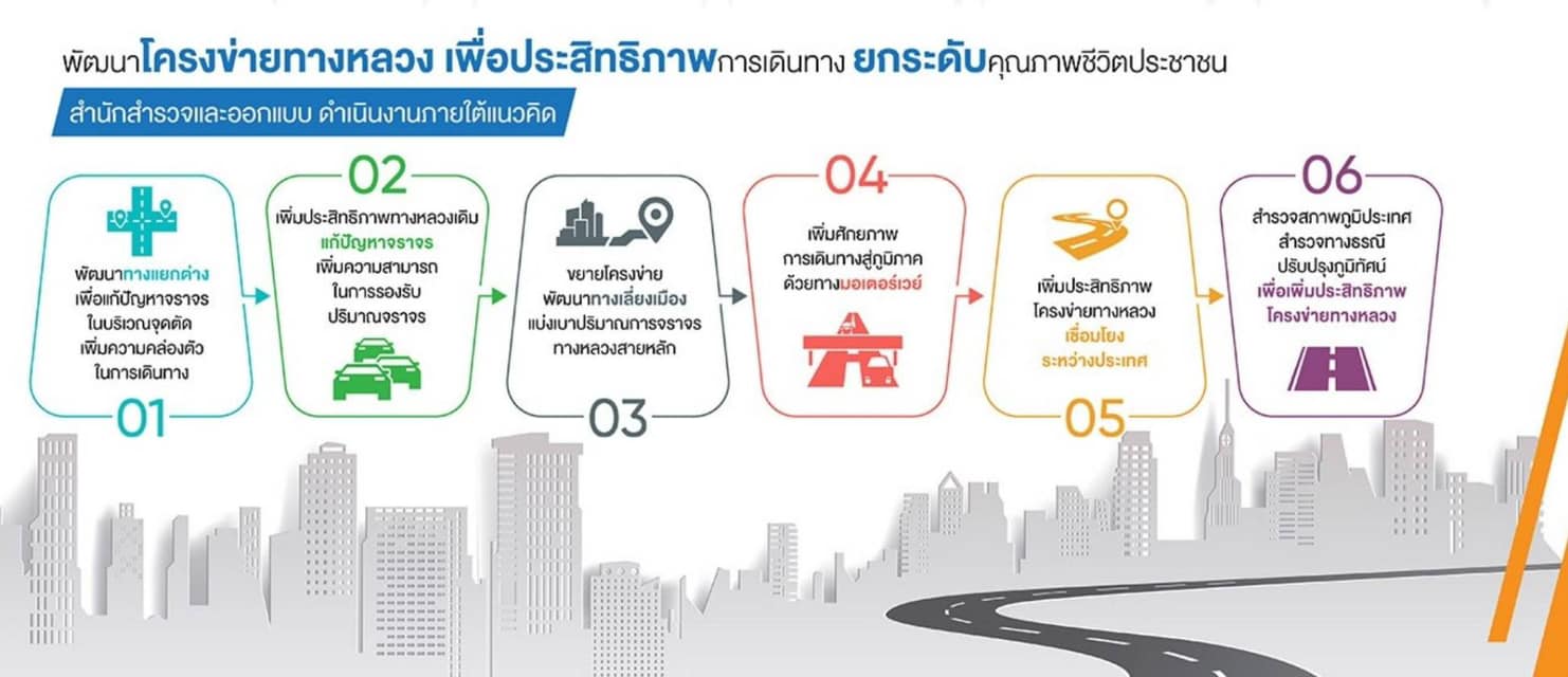 วิสัยทัศน์ : เป็นองค์กรชั้นนำด้านงานทาง เพิ่มประสิทธิภาพและพัฒนาทางหลวงอย่างยั่งยืน