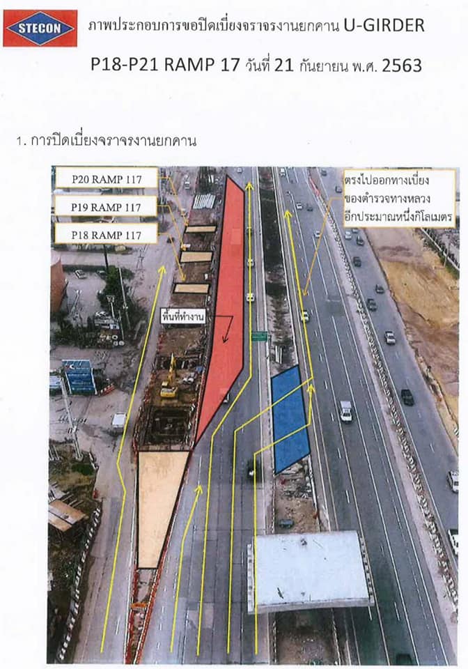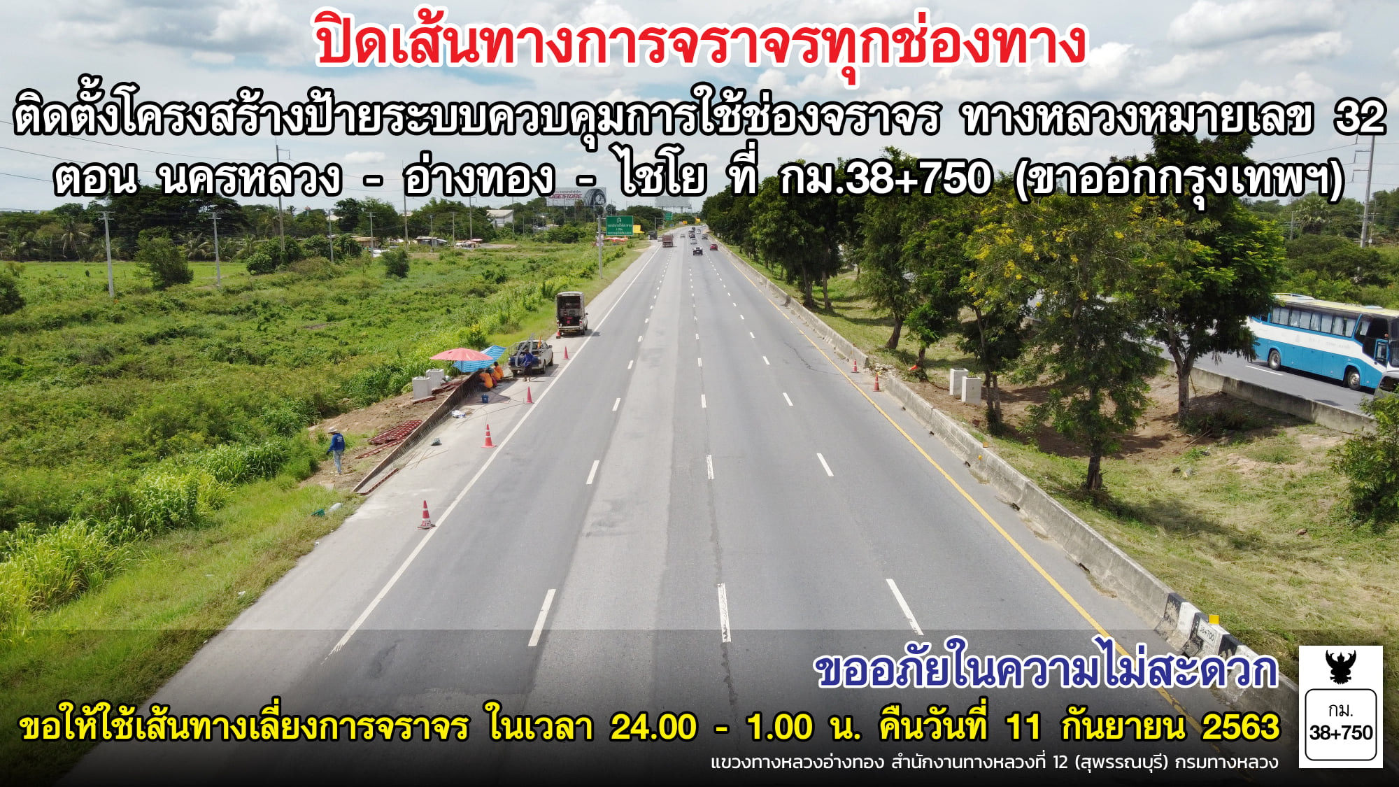 สำนักก่อสร้างสะพานจะทำการปิดเบี่ยงจราจรถนนพหลโยธินฝั่งขาออกไปสระบุรีที่ กม.56+200 พื้นที่ ต.ลำไทร อ.วังน้อย จ.พระนครศรีอยุธยา ในวันที่ 21 กันยายน 2563 เวลา 22.00 น. – 04.00 น. ของวันที่ 22 กันยายน 2563