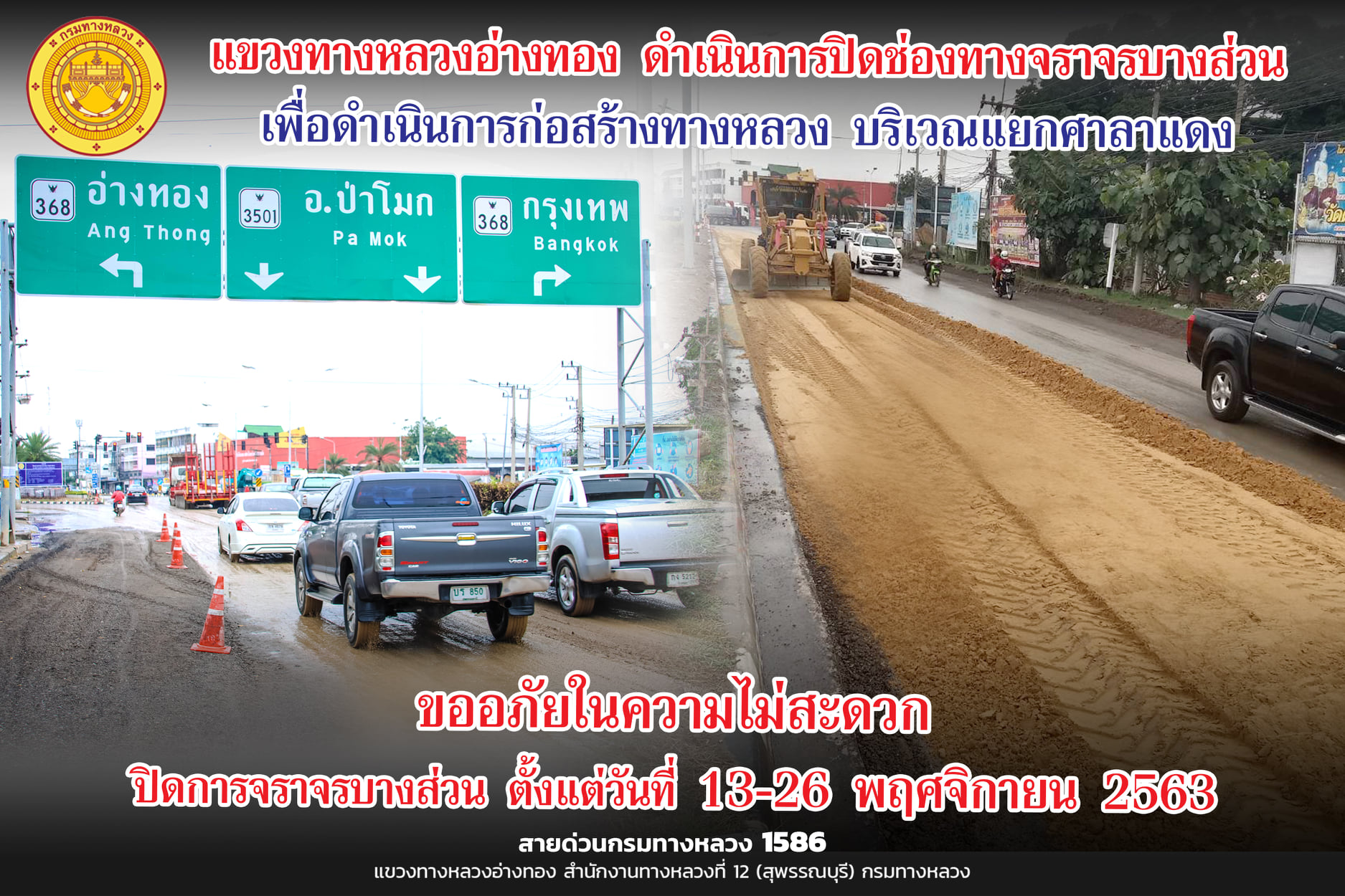 เลี่ยงเส้นทางจุดก่อสร้าง บริเวณแยกศาลาแดง ตั้งแต่วันที่ 13-26 พฤศจิกายน 2563