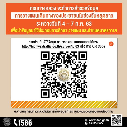 กรมทางหลวงขอเชิญชวนประชาชนรวมทำแบบสำรวจข้อมูลการวางแผนเดินทางของประชาชนในช่วงวันหยุดยาวระหว่างวันที่4-7 ก.ค. 63