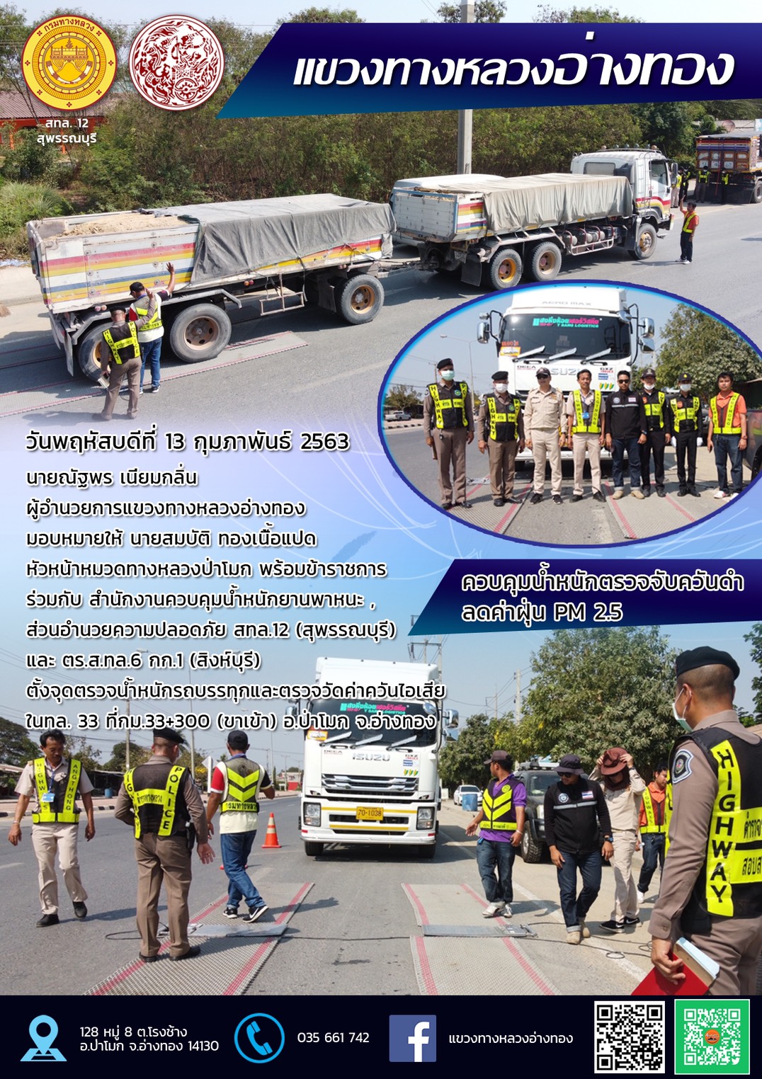 ตั้งจุดตรวจน้ำหนักรถบรรทุกและตรวจวัดค่าควันไอเสีย ในทางหลวงหมายเลข 33 ที่กม.33+300