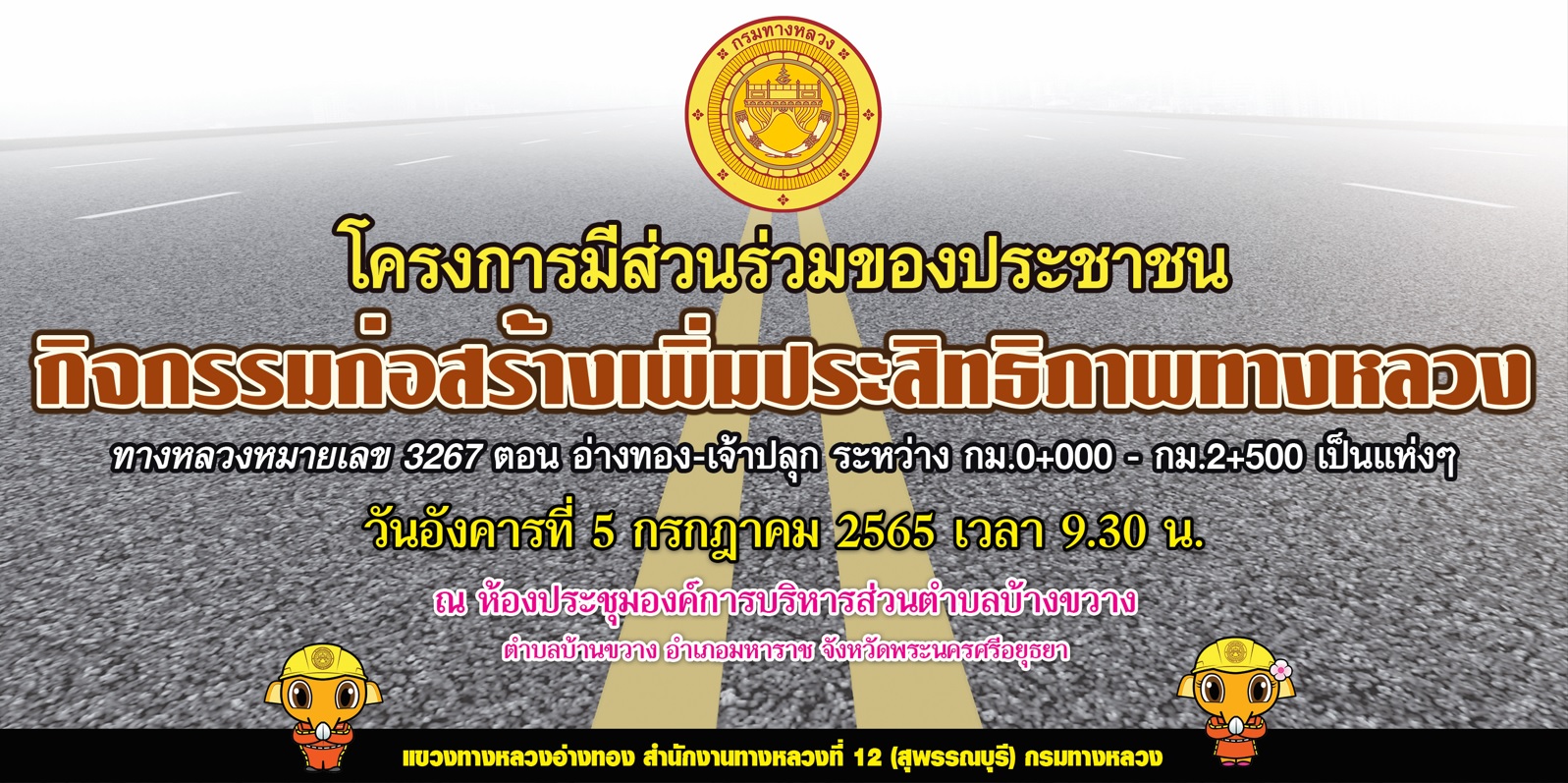 โครงการ การมีส่วนร่วมของประชาชน กิจกรรมก่อสร้างเพิ่มประสิทธิภาพทางหลวง ทางหลวงหมายเลข 3267 ตอน อ่างทอง – เจ้าปลุก ระหว่าง กม.0+000 - กม.2+500 เป็นแห่งๆ ระยะทาง 2.500 กิโลเมตร