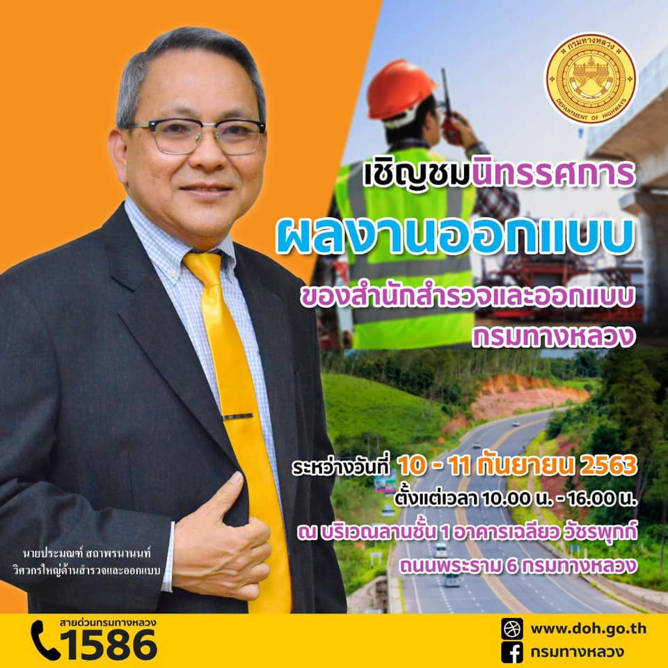 กรมทางหลวง โดยสำนักสำรวจและออกแบบ จัดนิทรรศการผลงานออกแบบภายใต้แนวคิด “พัฒนาโครงข่ายทางหลวง เพื่อประสิทธิภาพการเดินทาง ยกระดับคุณภาพชีวิตประชาชน” โดยวัตถุประสงค์เพื่อเผยแพร่แลกเปลี่ยนแนวความคิดในการออกแบบโครงการต่างๆ ของสำนักสำรวจและออกแบบ กรมทางหลวง กับบุคลากรและนักวิชาการเพื่อพัฒนางานออกแบบให้มีประสิทธิภาพและประสิทธิผลมากยิ่งขึ้น