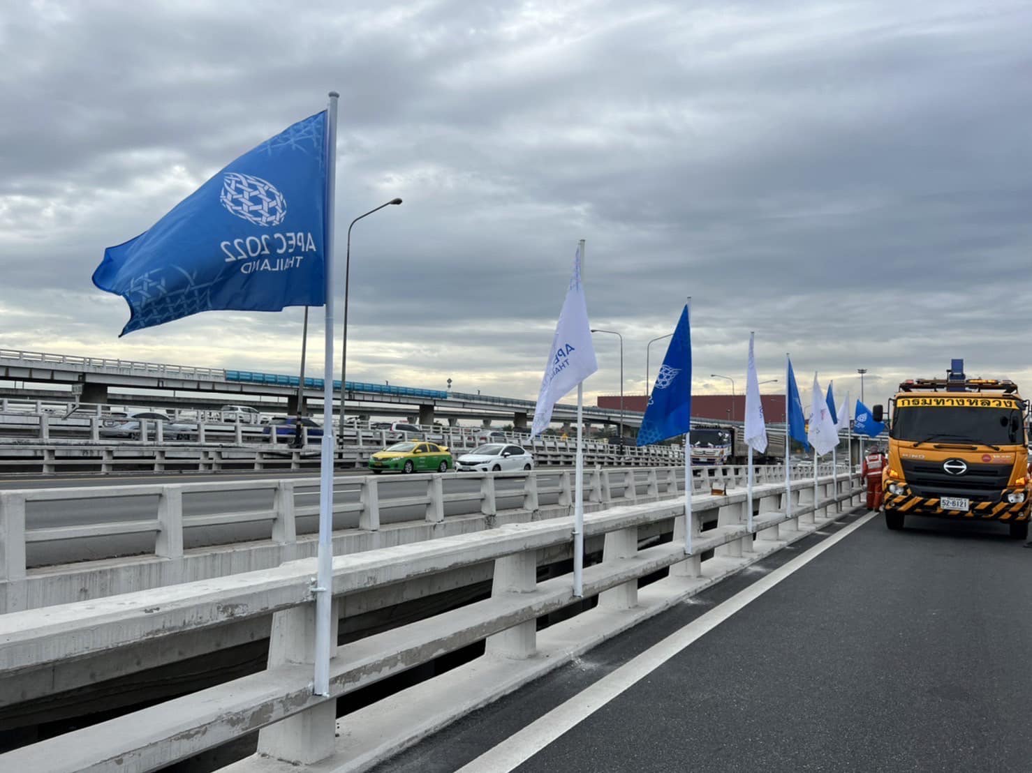 นอกจากนี้ แขวงทางหลวงในพื้นที่ได้ดำเนินการประดับธง APEC ในสายทางที่รับผิดชอบ จำนวน 2,204 ผืน และบนทางยกระดับอุตราภิมุข (ดอนเมืองโทลล์เวย์) จำนวน 88 ผืน พร้อมแสดงข้อความต้อนรับด้วยป้ายปรับเปลี่ยนข้อความ (VMS) จำนวน 46 ป้าย บนทางหลวงพิเศษหมายเลข 7 (กรุงเทพ – มาบตาพุด) และบนทางหลวงพิเศษหมายเลข 9 (บางปะอิน - บางพลี) ซึ่งในช่วงวันหยุดยาวระหว่างวันที่ 16 – 20 พฤศจิกายน 2565 รวม 5 วัน สำนักอำนวยความปลอดภัย กรมทางหลวง คาดการณ์ปริมาณจราจรบนทางหลวงสายหลัก 10 เส้นทาง และบนมอเตอร์เวย์รวมทั้งสิ้นจำนวน 4,932,879 คัน แบ่งเป็นฝั่งขาเข้ากรุงเทพ 2,509,404 คัน และฝั่งขาออกกรุงเทพ 2,423,475 คัน
