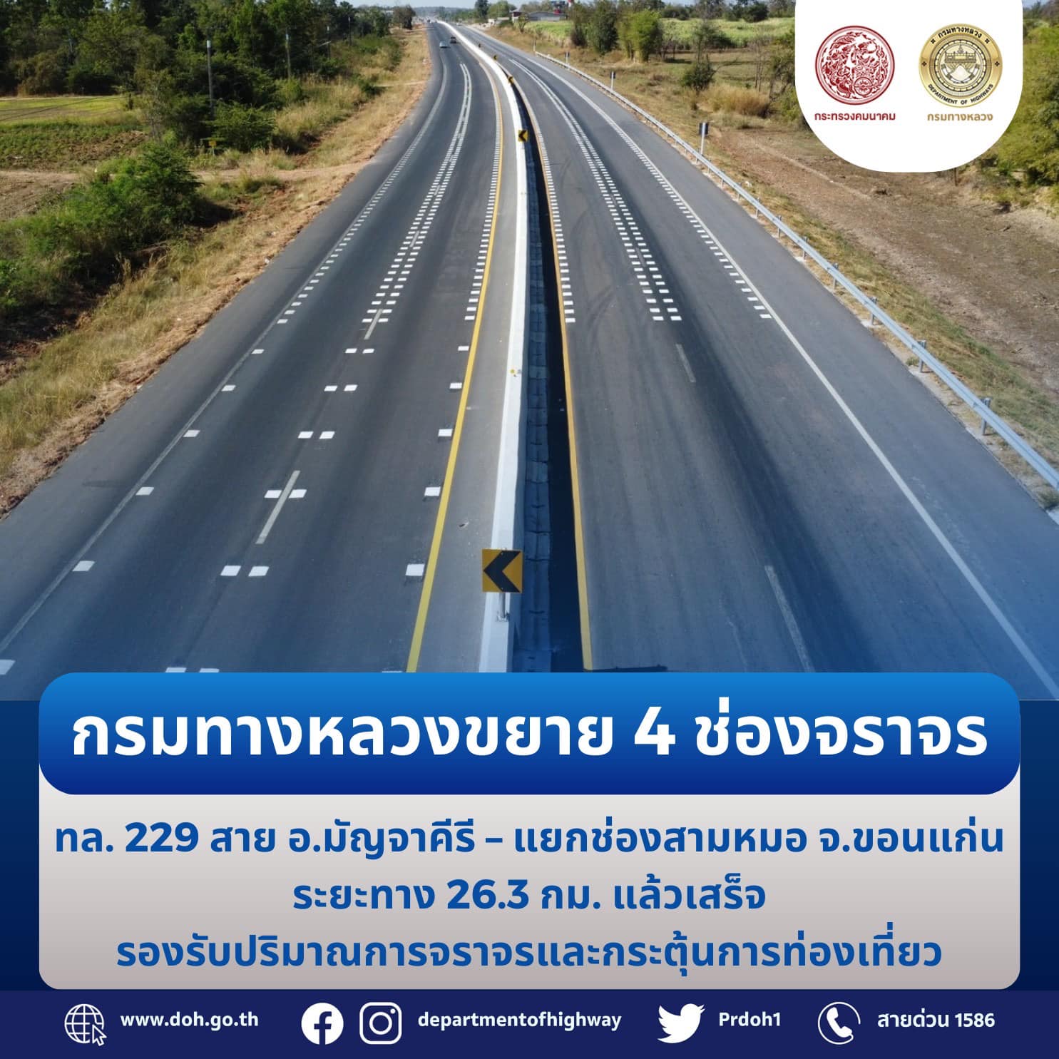 กรมทางหลวงขยาย 4 ช่องจราจร ทางหลวงหมายเลข 229 สาย อ.มัญจาคีรี – แยกช่องสามหมอ จ.ขอนแก่น ระยะทาง 26.335 กม. แล้วเสร็จ เพิ่มประสิทธิภาพการขนส่ง กระตุ้นเศรษฐกิจ และการท่องเที่ยวภาคอีสาน