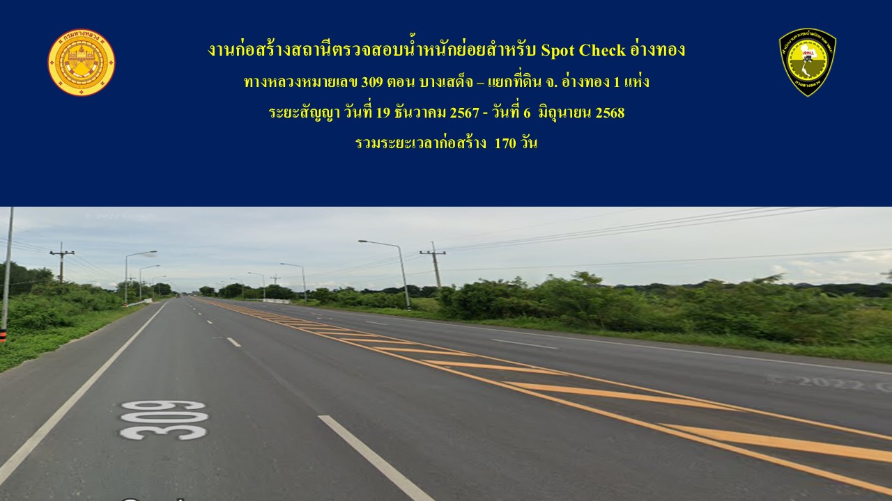 แจ้งเบี่ยงการจราจร งานก่อสร้างสถานีตรวจสอบน้ำหนักย่อยสำหรับ Spot Check อ่างทอง ทางหลวงหมายเลข 309 ตอน บางเสด็จ – แยกที่ดิน จ. อ่างทอง