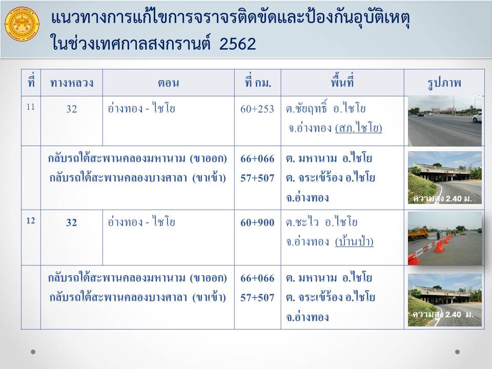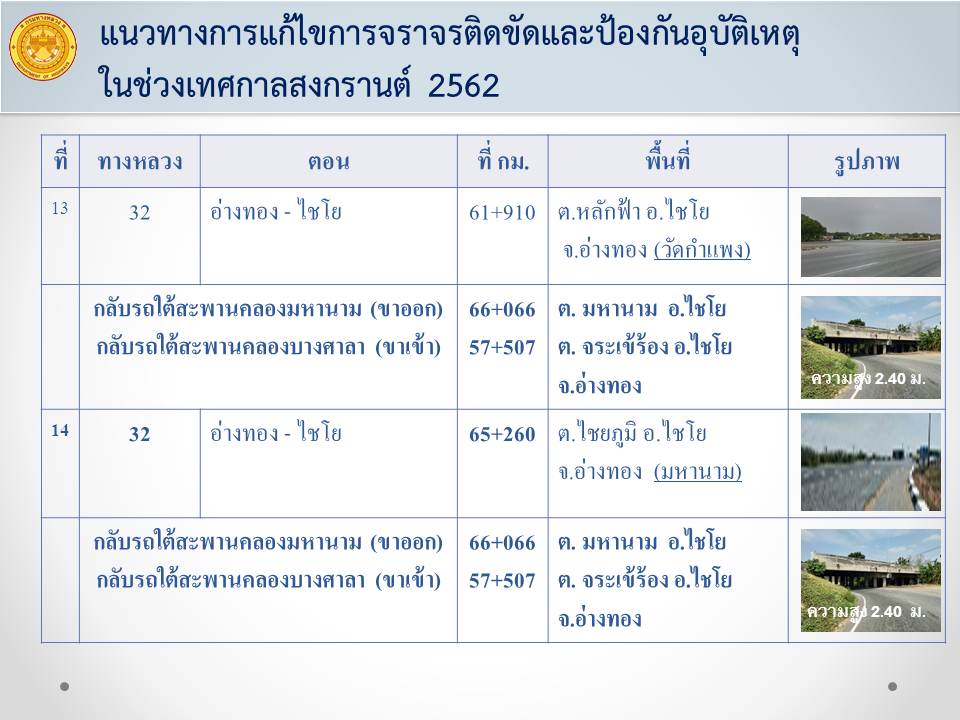 ด้วยเทศกาลสงกรานต์ 2562 จะมีประชาชนสัญจรในเส้นทางสายหลักจำนวนมาก เพื่อให้เกิดความปลอดภัยในการเดินทาง และลดจุดเสี่ยงที่จะทำให้เกิดอุบัติเหตุทางถนนสายหลัก แขวงทางหลวงอ่างทองจึงได้ทำการปิดจุดกลับรถบนทางหลวงหมายเลข 32 ตอน นครหลวง - อ่างทอง –ไชโย จำนวน 15 แห่ง เป็นการชั่วคราว