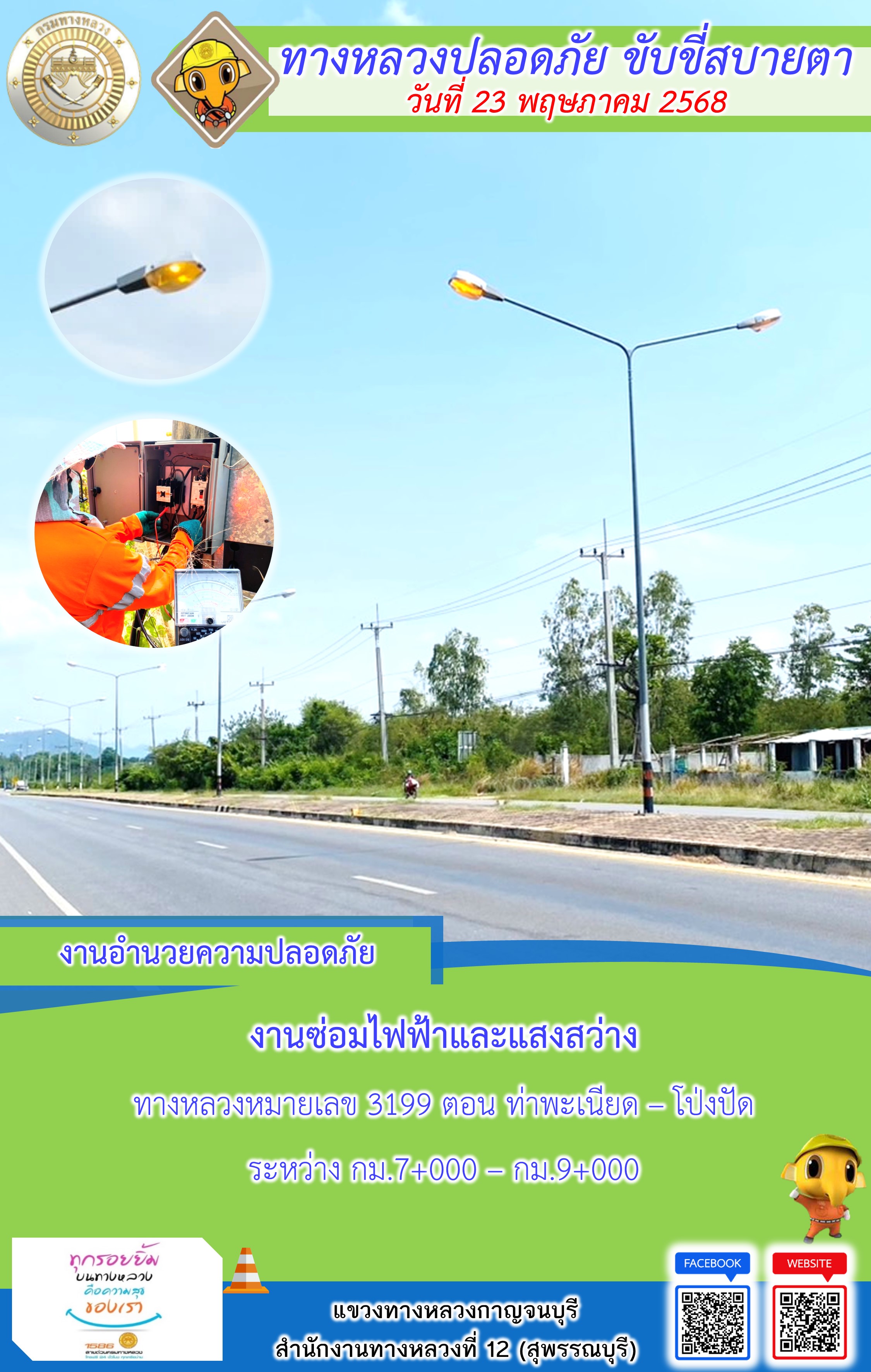 แขวงทางหลวงกาญจนบุรี โดยหมวดทางหลวงในสังกัด และงานอำนวยความปลอดภัยปฏิบัติงาน ประจำวันที่ 23 พ.ค. 68