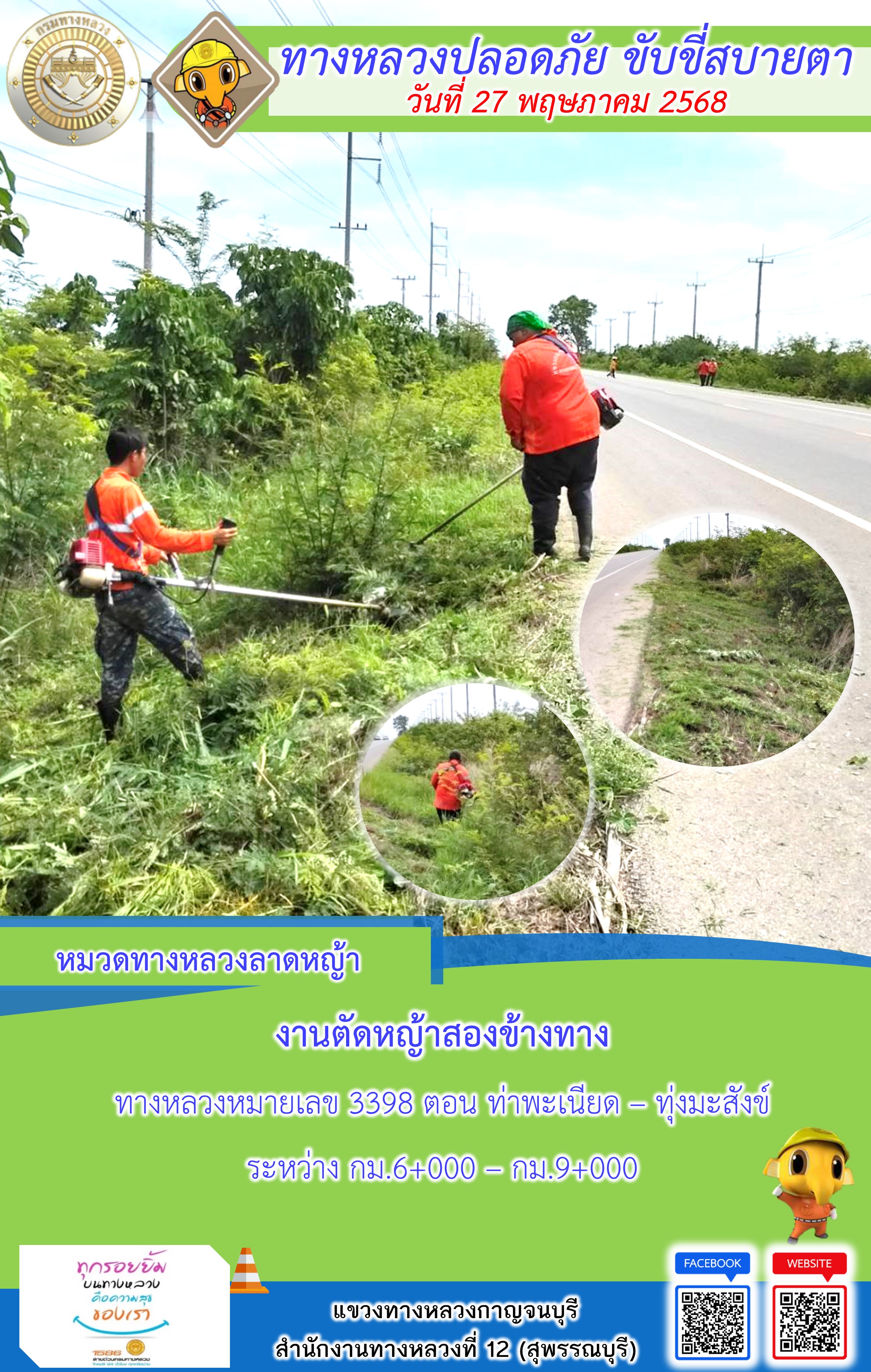 แขวงทางหลวงกาญจนบุรี โดยหมวดทางหลวงในสังกัด และงานอำนวยความปลอดภัยปฏิบัติงาน ประจำวันที่ 27 พ.ค. 68