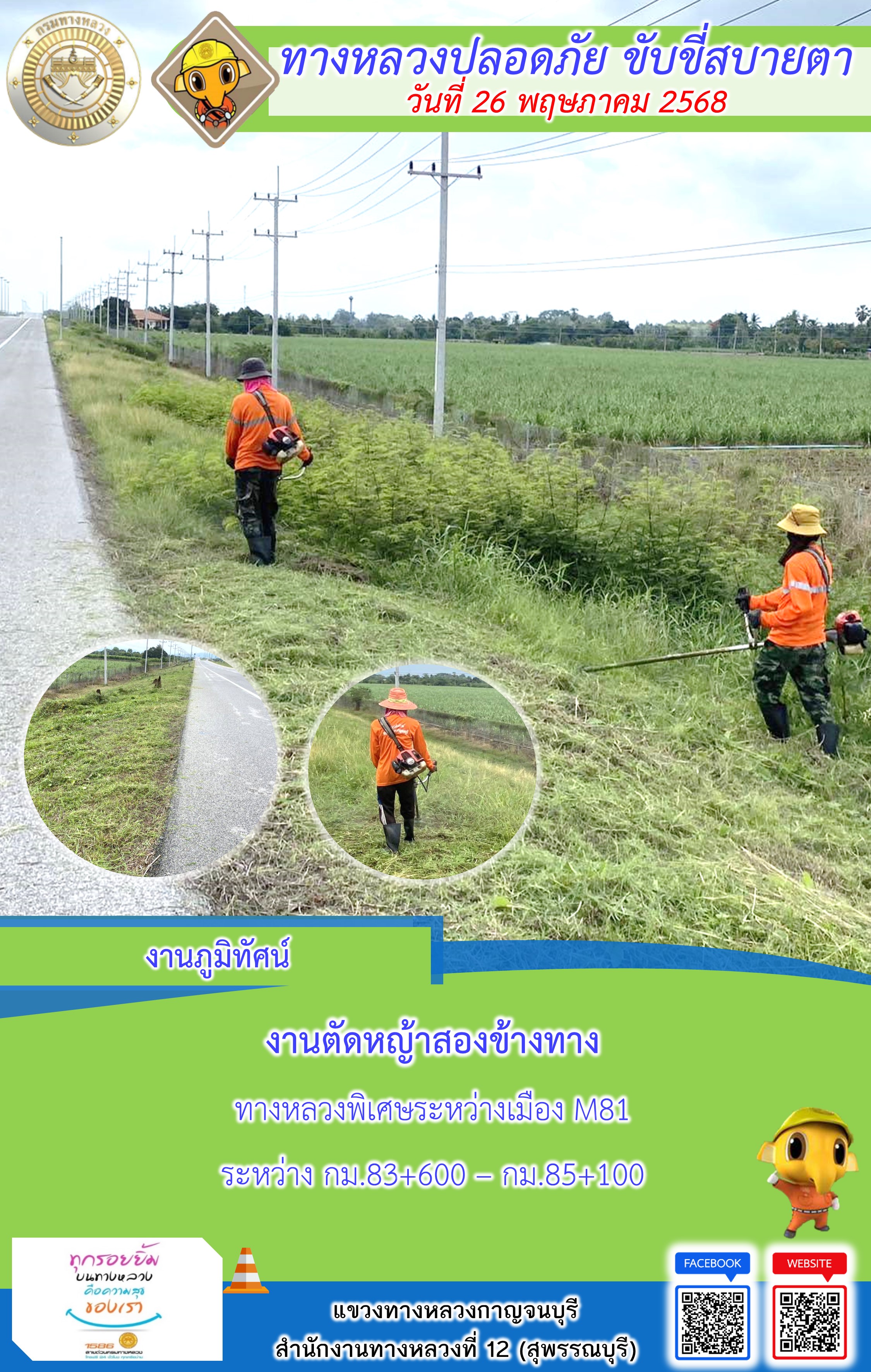 แขวงทางหลวงกาญจนบุรี โดยหมวดทางหลวงในสังกัด และงานอำนวยความปลอดภัยปฏิบัติงาน ประจำวันที่ 26 พ.ค. 68