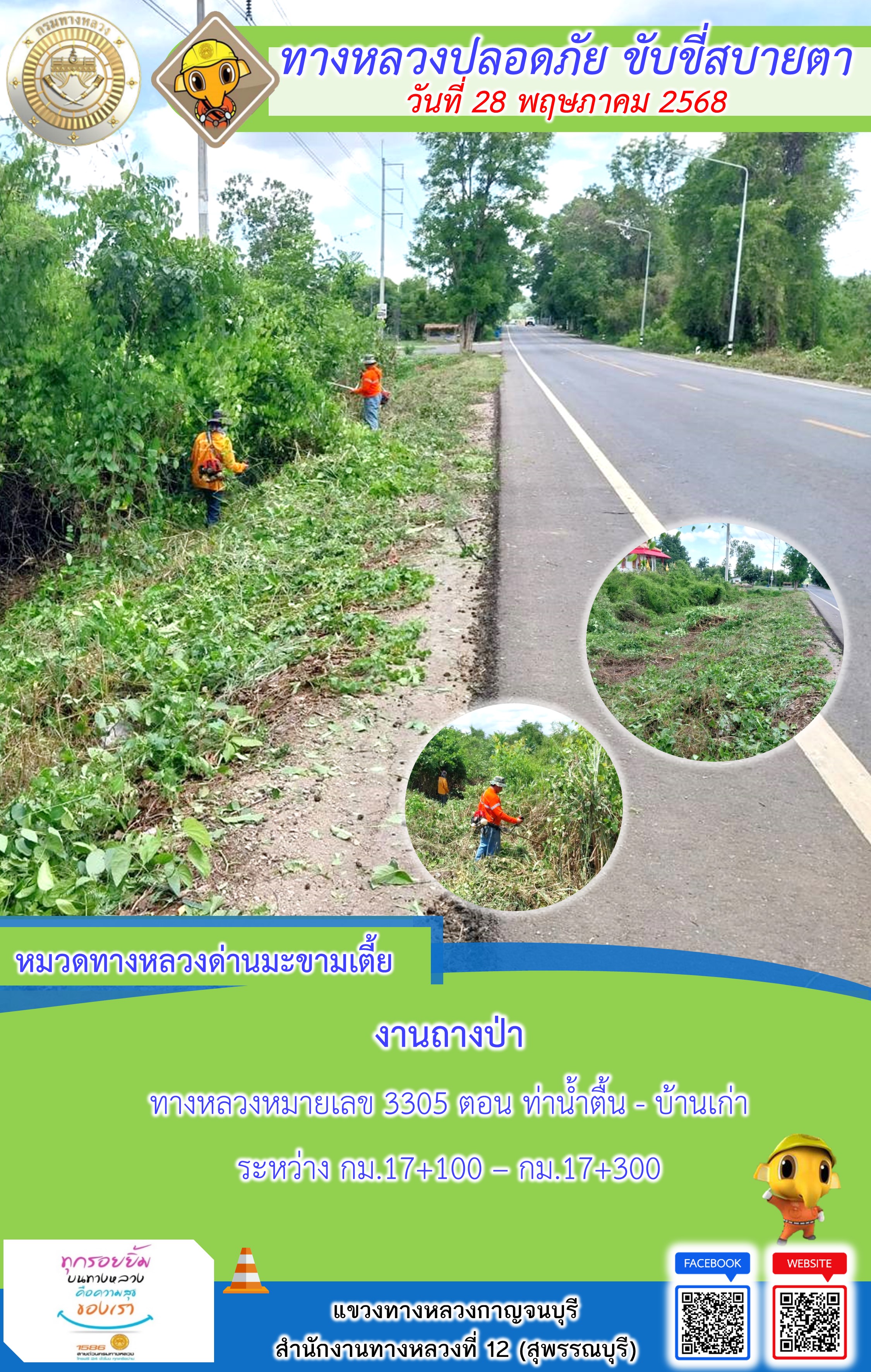 แขวงทางหลวงกาญจนบุรี โดยหมวดทางหลวงในสังกัด และงานอำนวยความปลอดภัยปฏิบัติงาน ประจำวันที่ 28 พ.ค. 68
