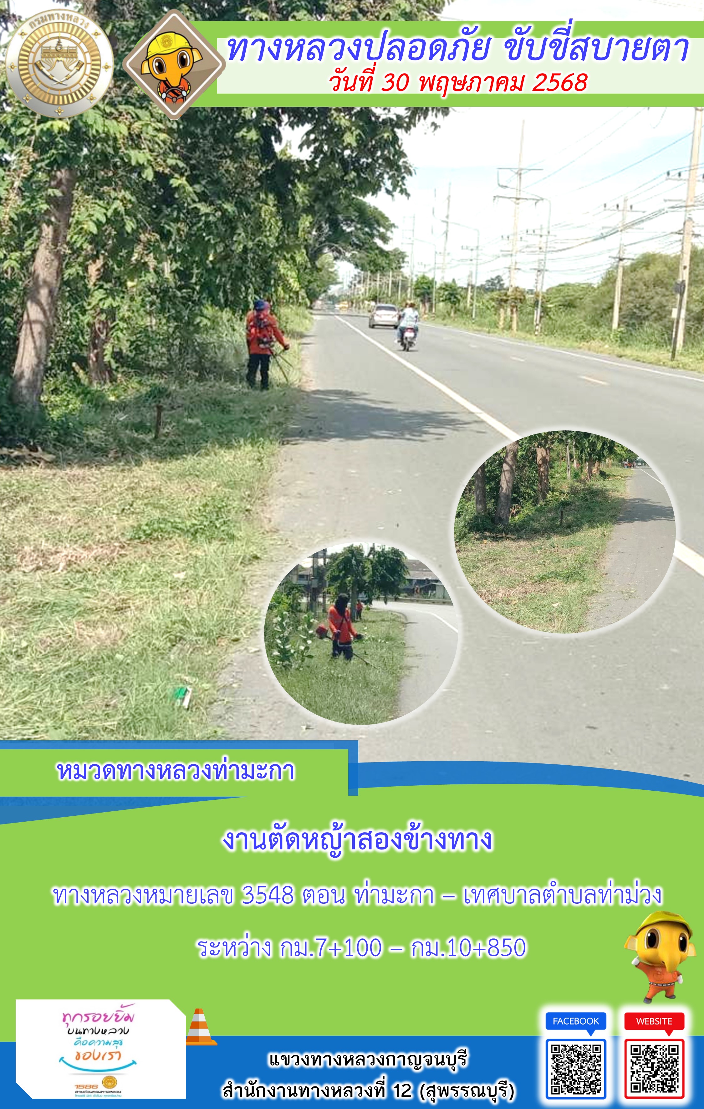 แขวงทางหลวงกาญจนบุรี โดยหมวดทางหลวงในสังกัด และงานอำนวยความปลอดภัยปฏิบัติงาน ประจำวันที่ 30 พ.ค. 68