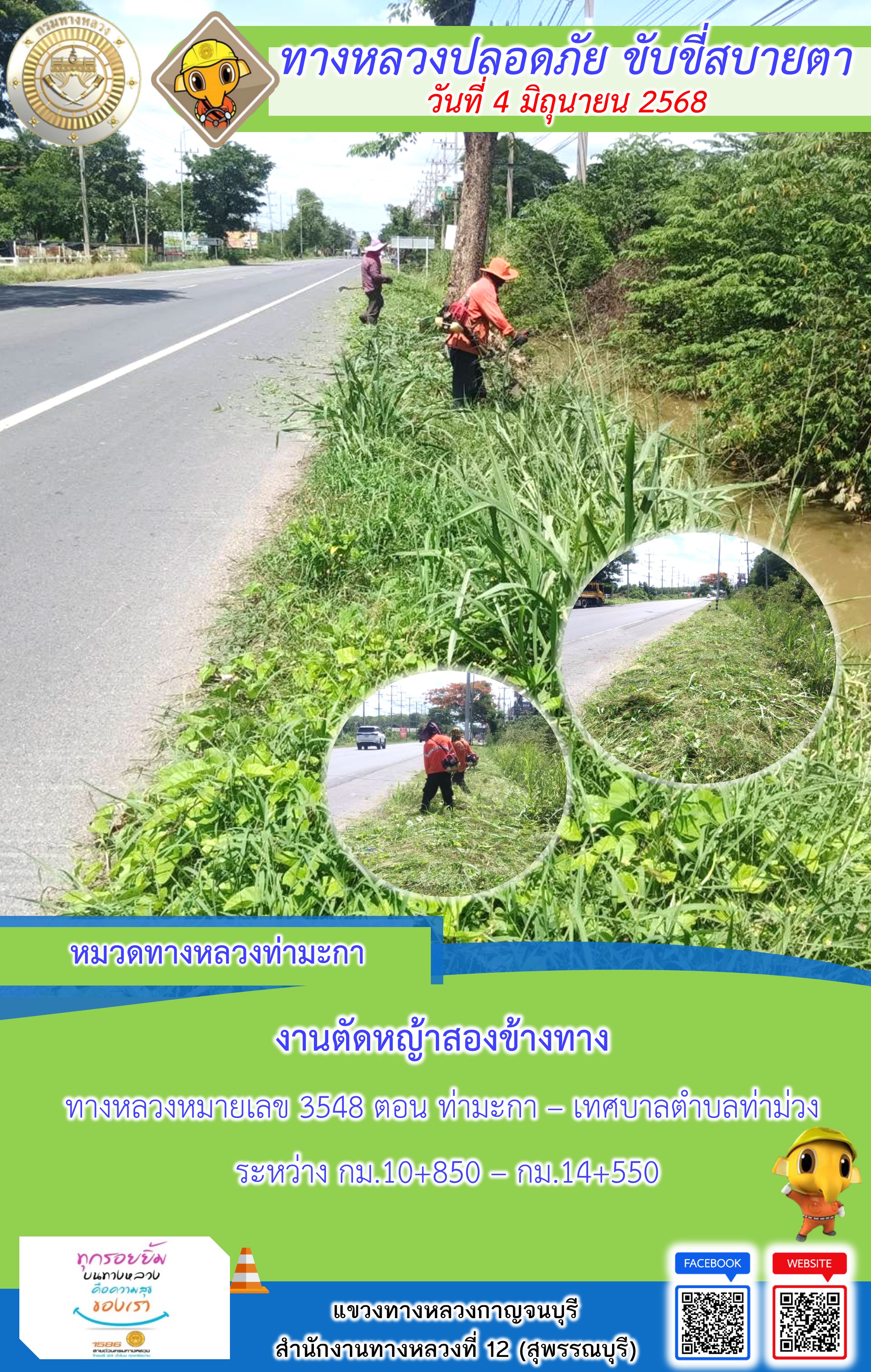 แขวงทางหลวงกาญจนบุรี โดยหมวดทางหลวงในสังกัด และงานอำนวยความปลอดภัยปฏิบัติงาน ประจำวันที่ 4 มิ.ย. 68
