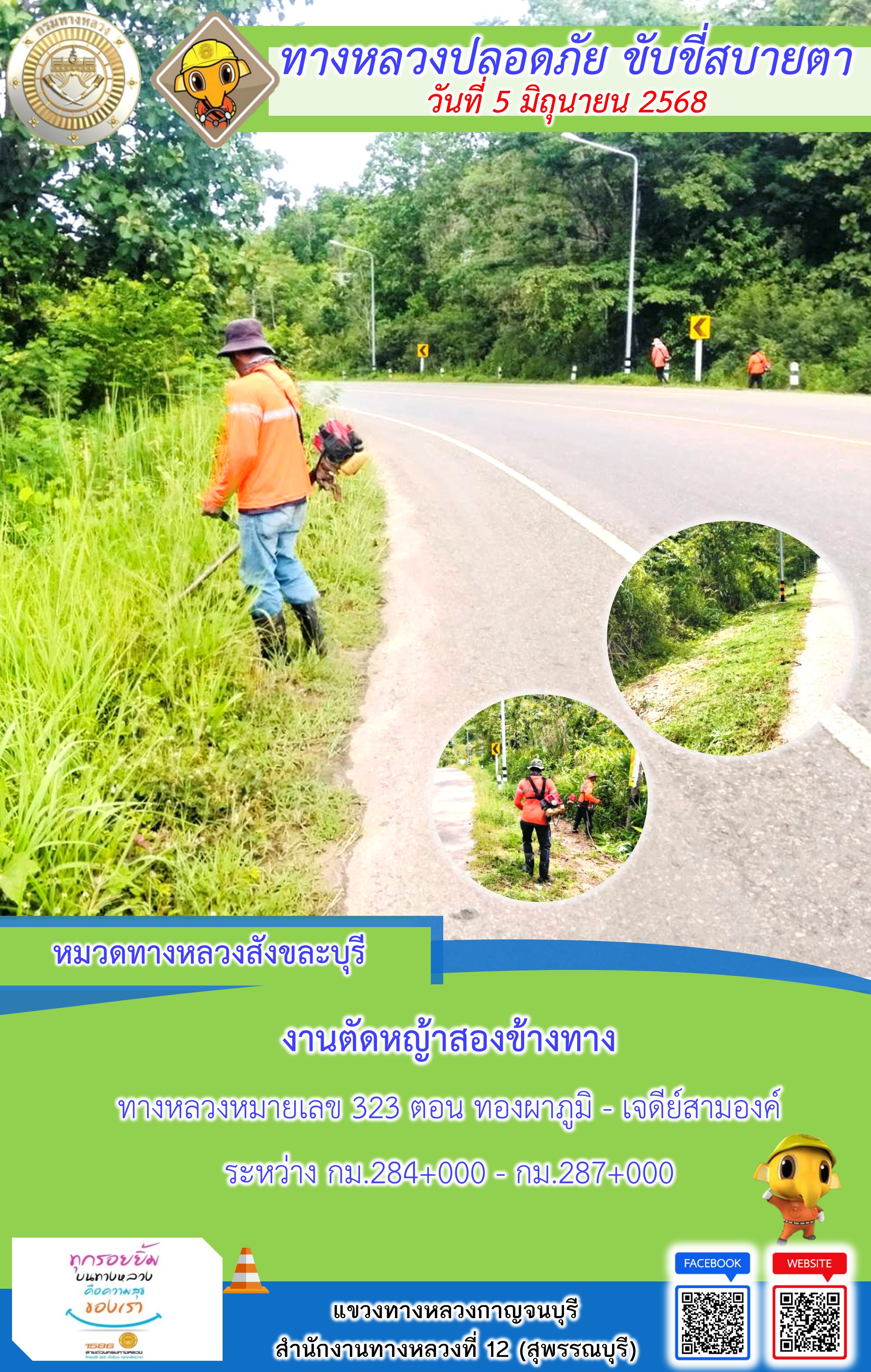 แขวงทางหลวงกาญจนบุรี โดยหมวดทางหลวงในสังกัด และงานอำนวยความปลอดภัยปฏิบัติงาน ประจำวันที่ 5 มิ.ย. 68