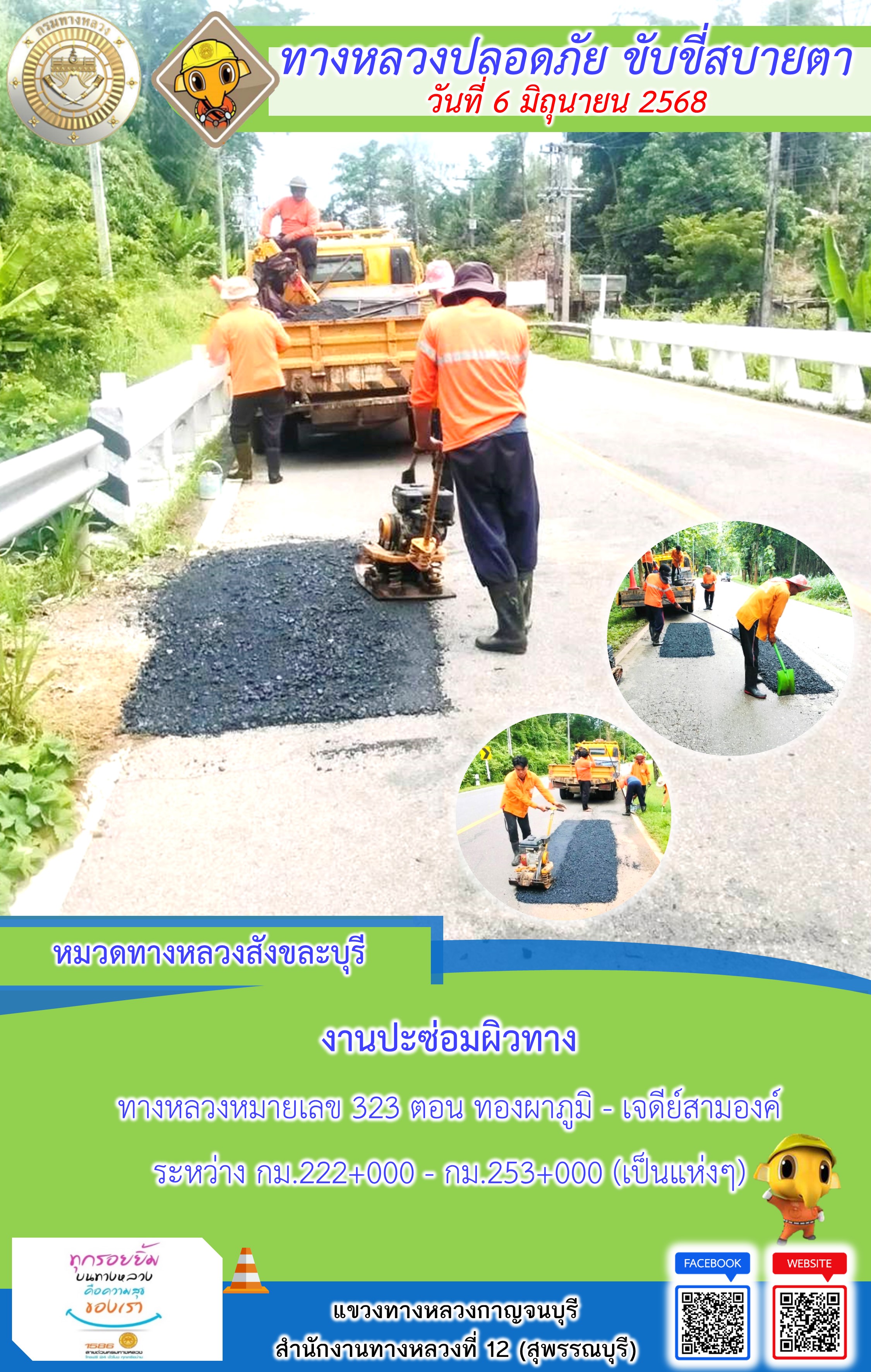 แขวงทางหลวงกาญจนบุรี โดยหมวดทางหลวงในสังกัด และงานอำนวยความปลอดภัยปฏิบัติงาน ประจำวันที่ 6 มิ.ย. 68