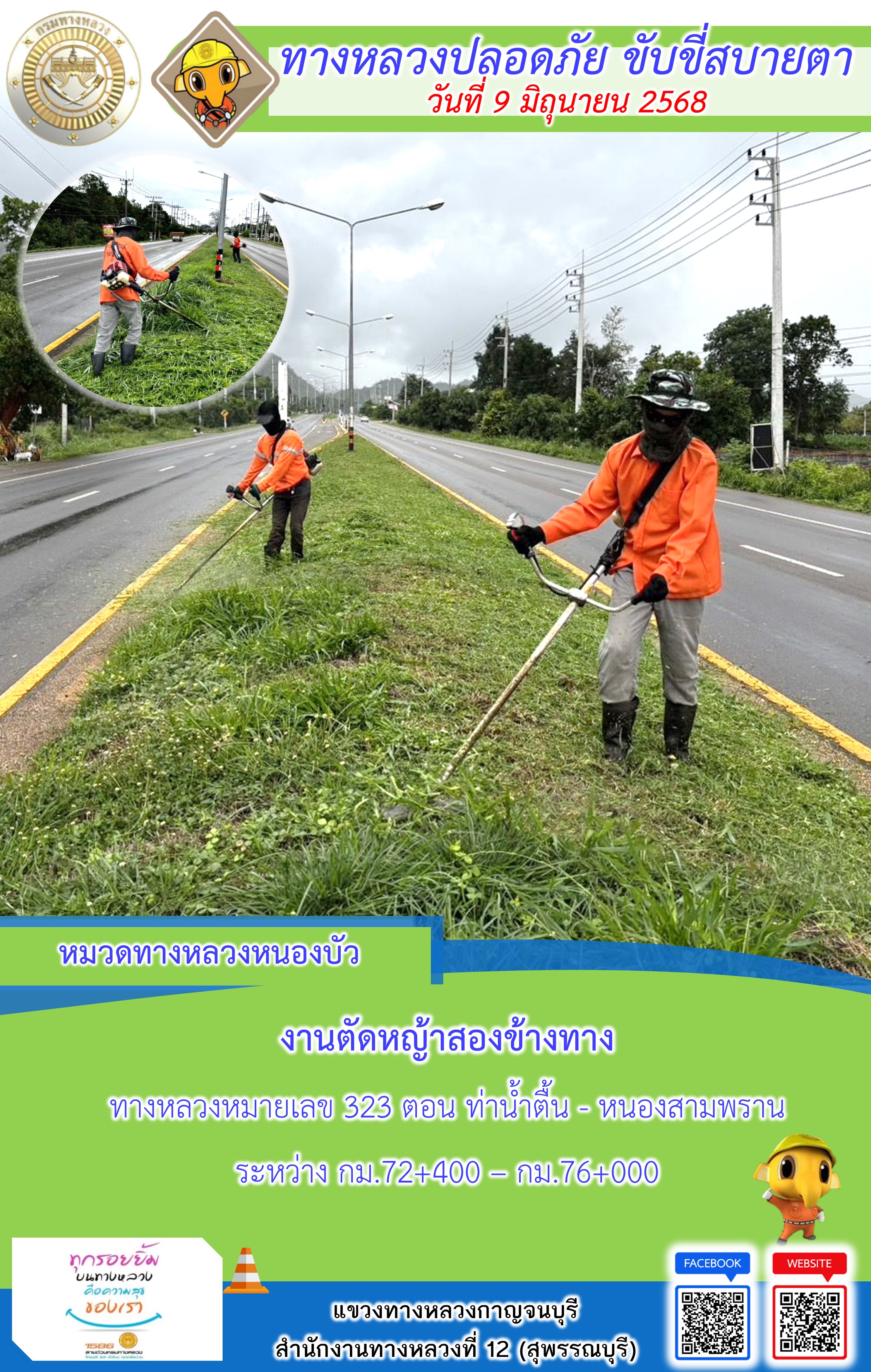 แขวงทางหลวงกาญจนบุรี โดยหมวดทางหลวงในสังกัด และงานอำนวยความปลอดภัยปฏิบัติงาน ประจำวันที่ 9 มิ.ย. 68