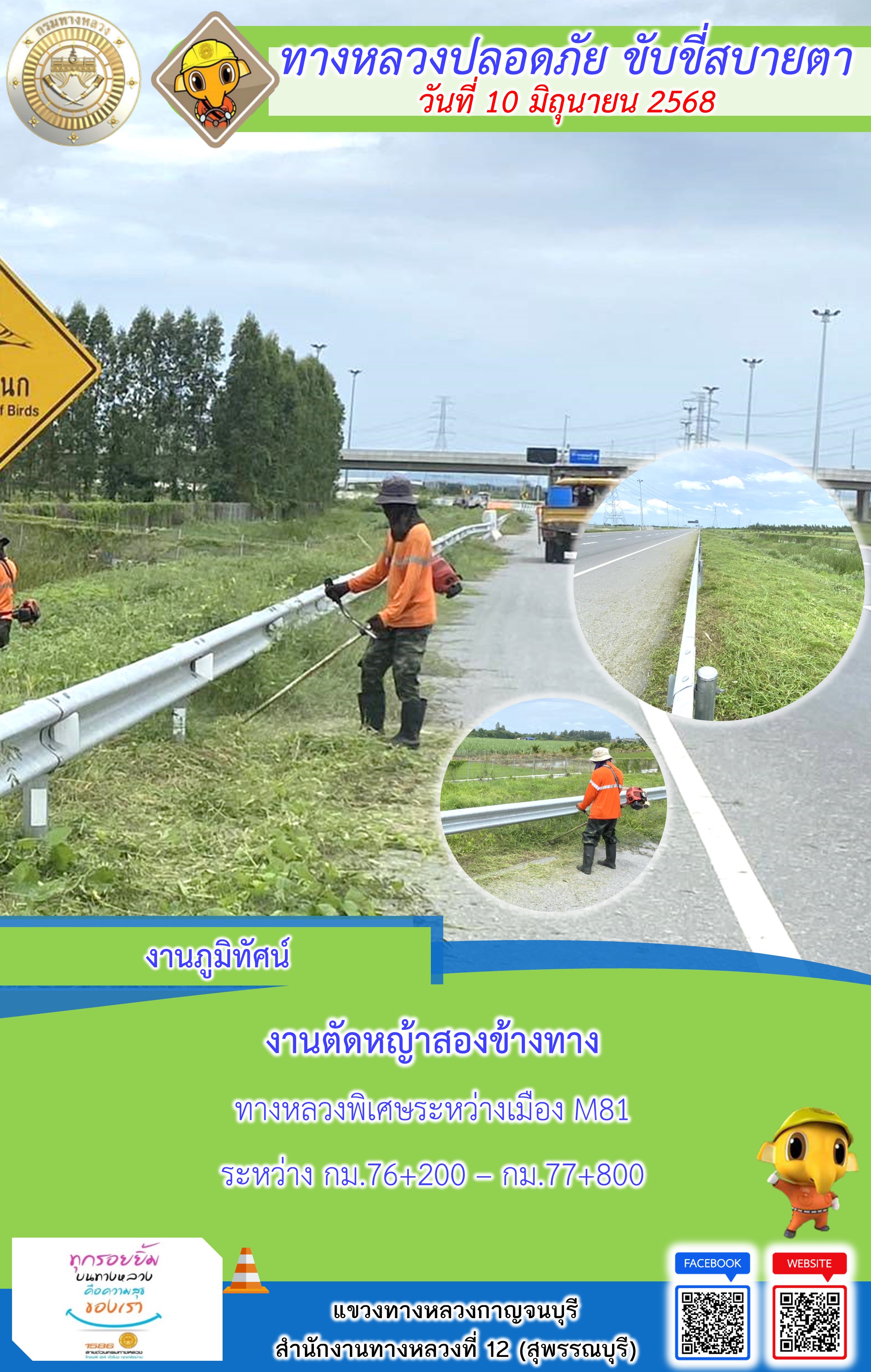แขวงทางหลวงกาญจนบุรี โดยหมวดทางหลวงในสังกัด และงานอำนวยความปลอดภัยปฏิบัติงาน ประจำวันที่ 10 มิ.ย. 68