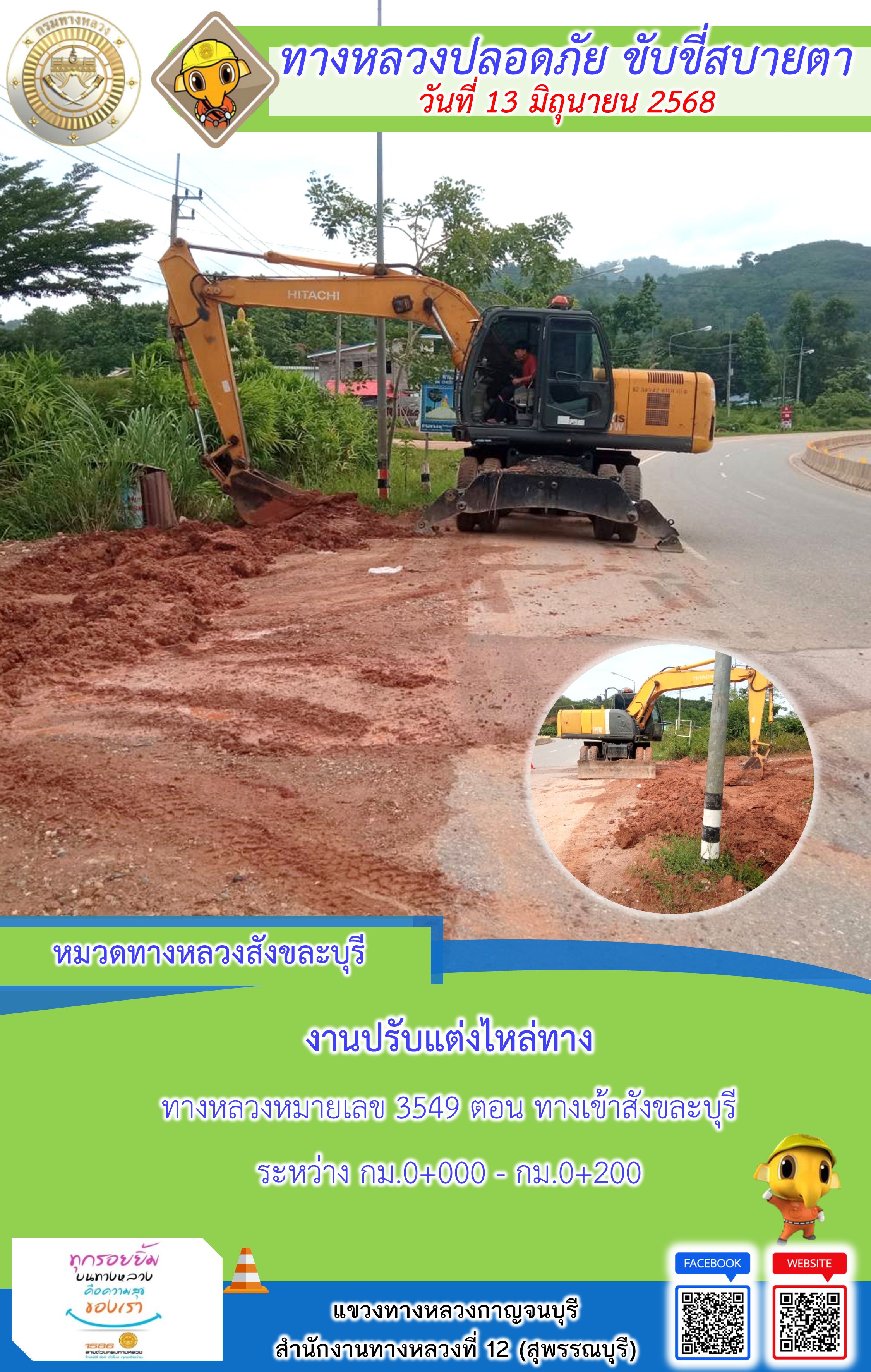 แขวงทางหลวงกาญจนบุรี โดยหมวดทางหลวงในสังกัด และงานอำนวยความปลอดภัยปฏิบัติงาน ประจำวันที่ 13 มิ.ย. 68