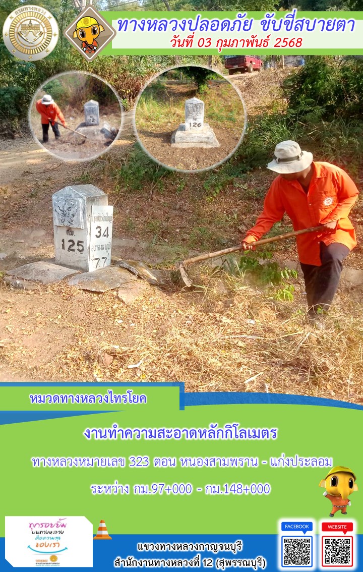 แขวงทางหลวงกาญจนบุรี โดยหมวดทางหลวงในสังกัด และงานอำนวยความปลอดภัยปฏิบัติงาน ประจำวันที่ 03 ก.พ. 68