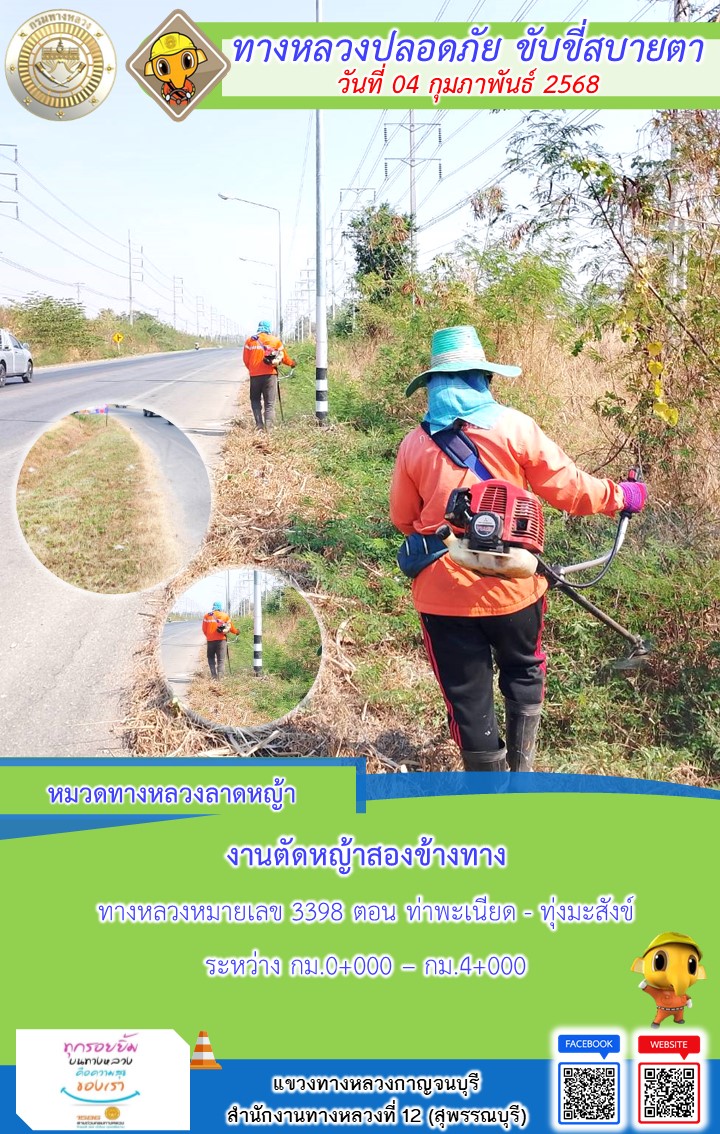 แขวงทางหลวงกาญจนบุรี โดยหมวดทางหลวงในสังกัด และงานอำนวยความปลอดภัยปฏิบัติงาน ประจำวันที่ 04 ก.พ. 68