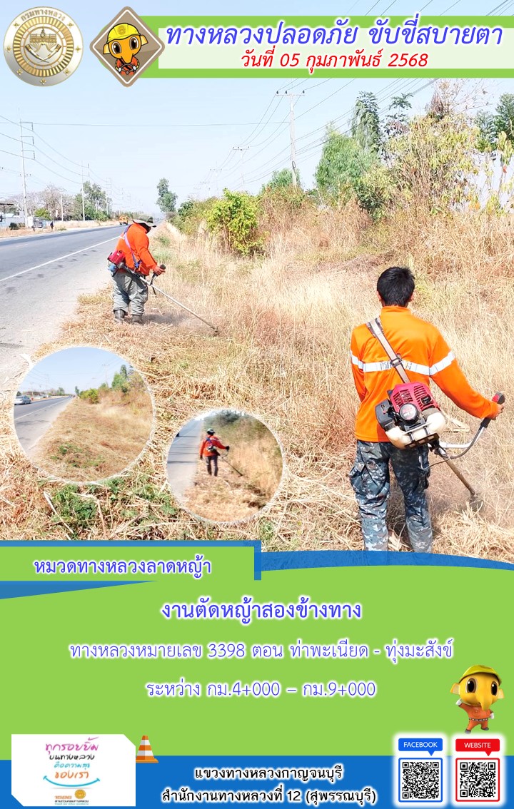 แขวงทางหลวงกาญจนบุรี โดยหมวดทางหลวงในสังกัด และงานอำนวยความปลอดภัยปฏิบัติงาน ประจำวันที่ 05 ก.พ. 68