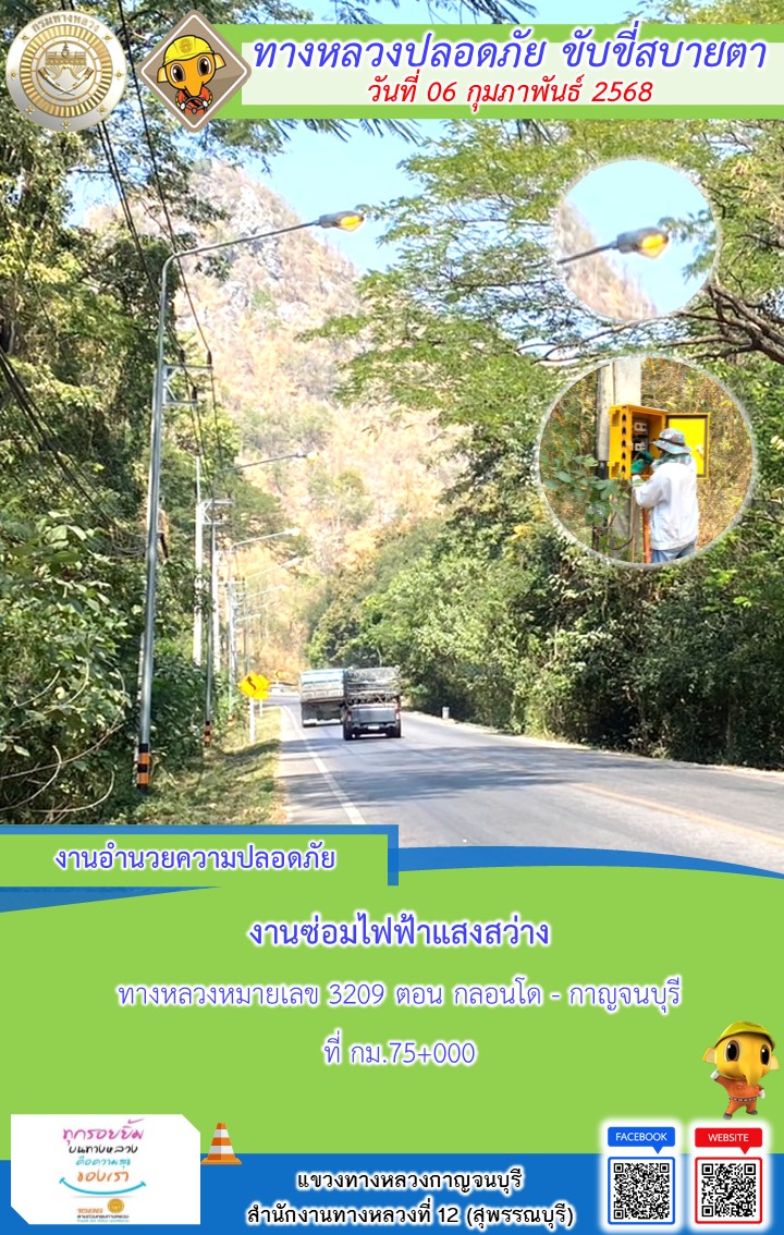 แขวงทางหลวงกาญจนบุรี โดยหมวดทางหลวงในสังกัด และงานอำนวยความปลอดภัยปฏิบัติงาน ประจำวันที่ 06 ก.พ. 68