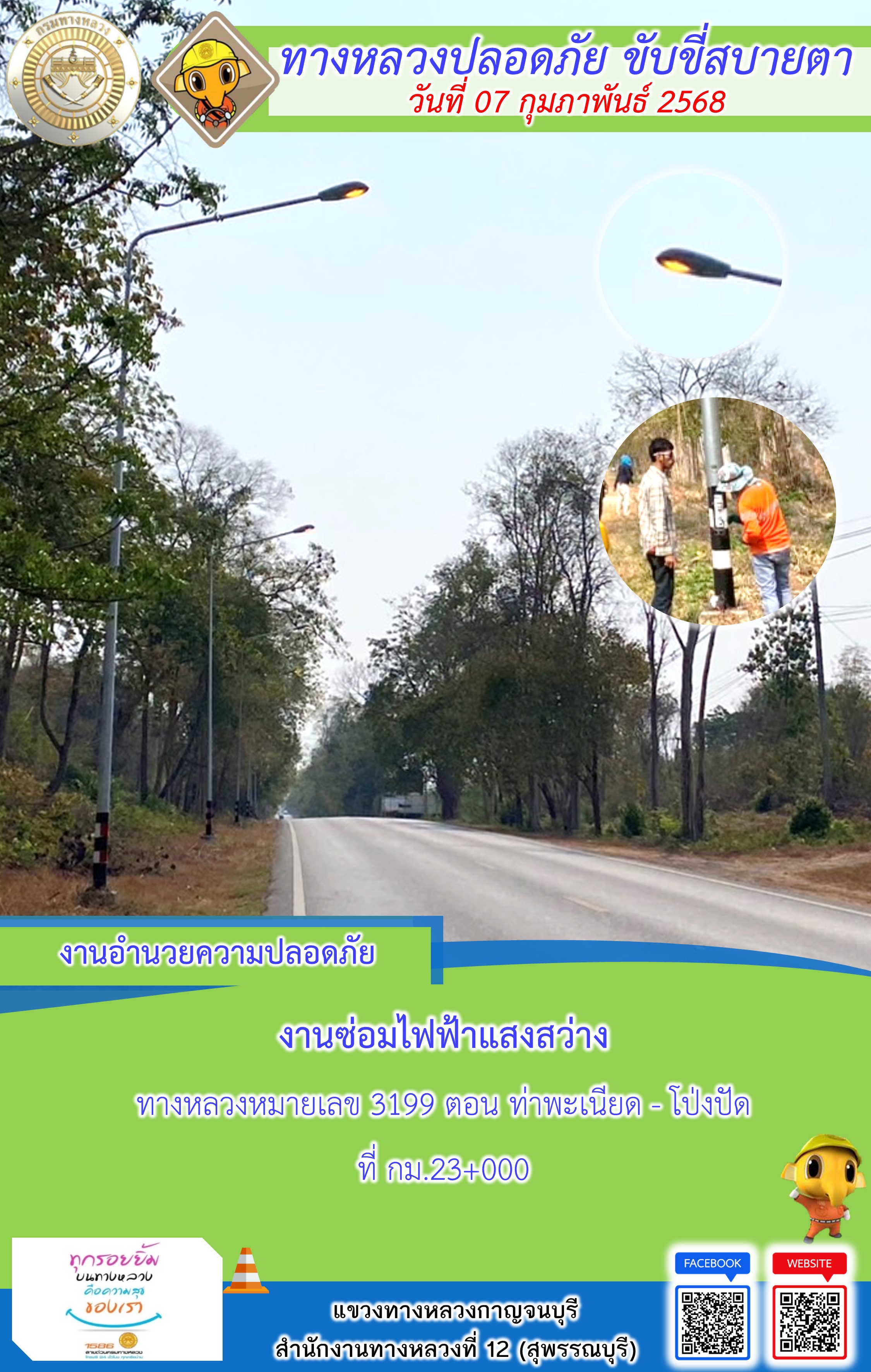 แขวงทางหลวงกาญจนบุรี โดยหมวดทางหลวงในสังกัด และงานอำนวยความปลอดภัยปฏิบัติงาน ประจำวันที่ 07 ก.พ. 68
