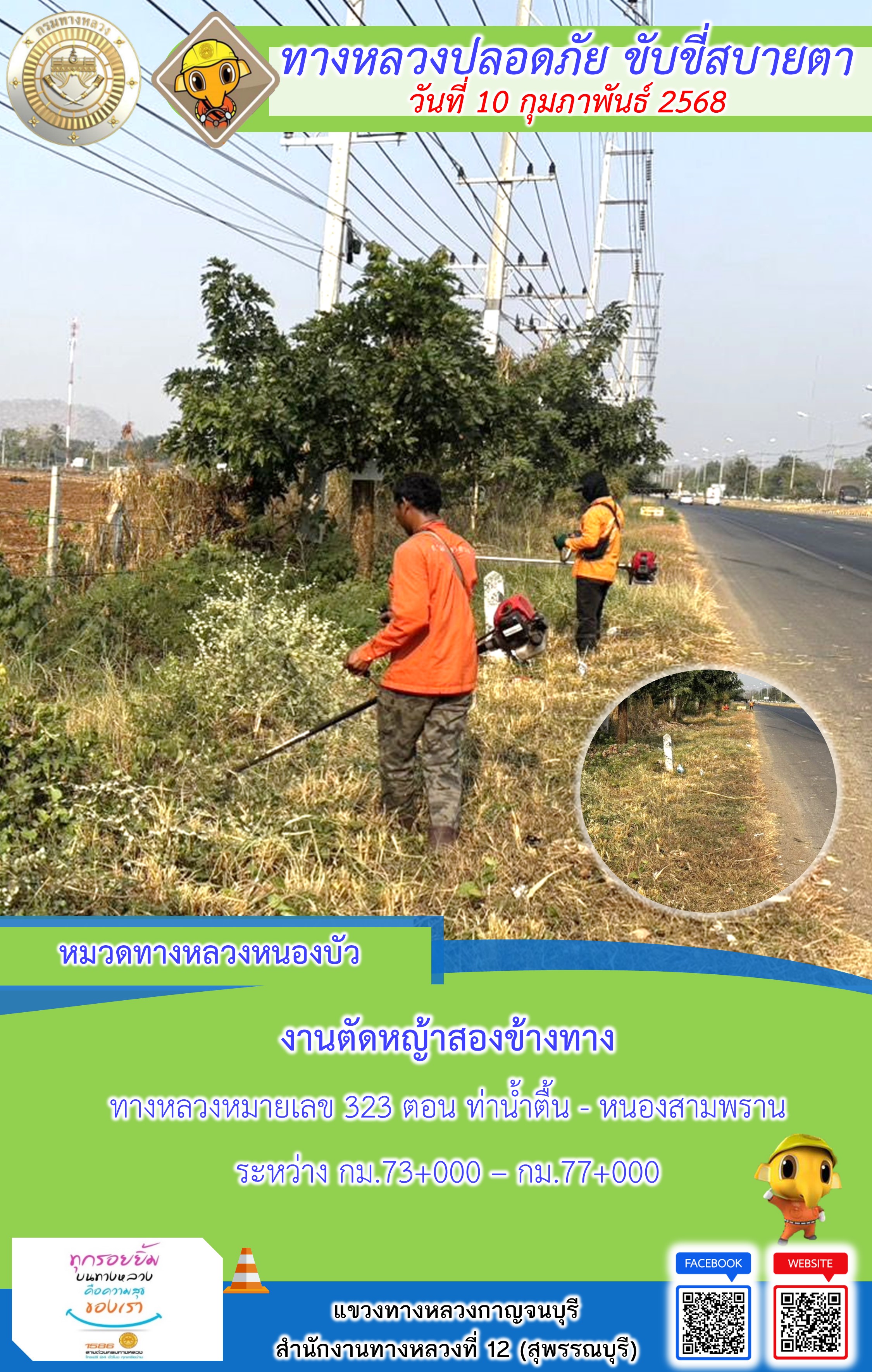 แขวงทางหลวงกาญจนบุรี โดยหมวดทางหลวงในสังกัด และงานอำนวยความปลอดภัยปฏิบัติงาน ประจำวันที่ 10 ก.พ. 68
