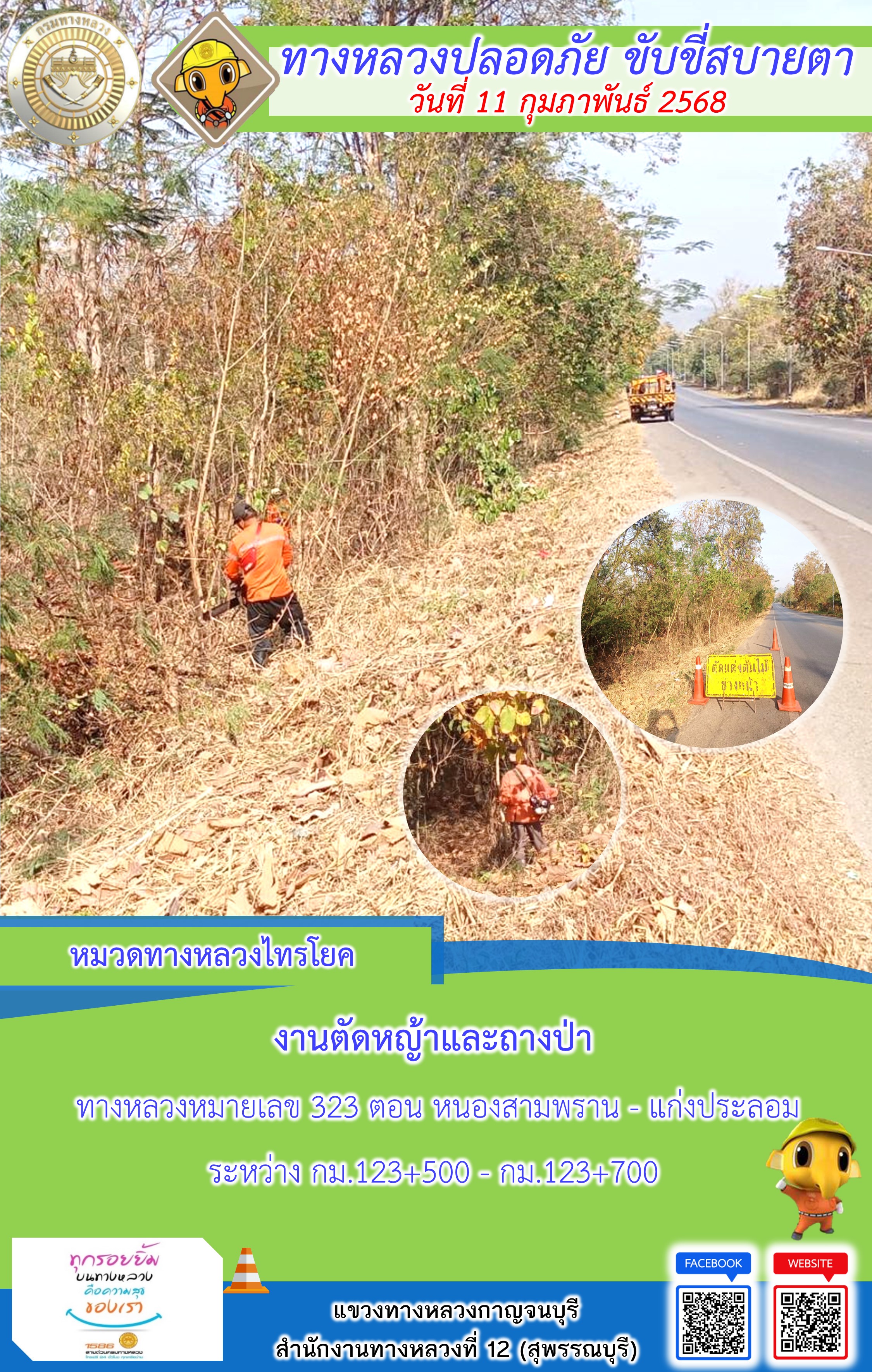 แขวงทางหลวงกาญจนบุรี โดยหมวดทางหลวงในสังกัด และงานอำนวยความปลอดภัยปฏิบัติงาน ประจำวันที่ 11 ก.พ. 68