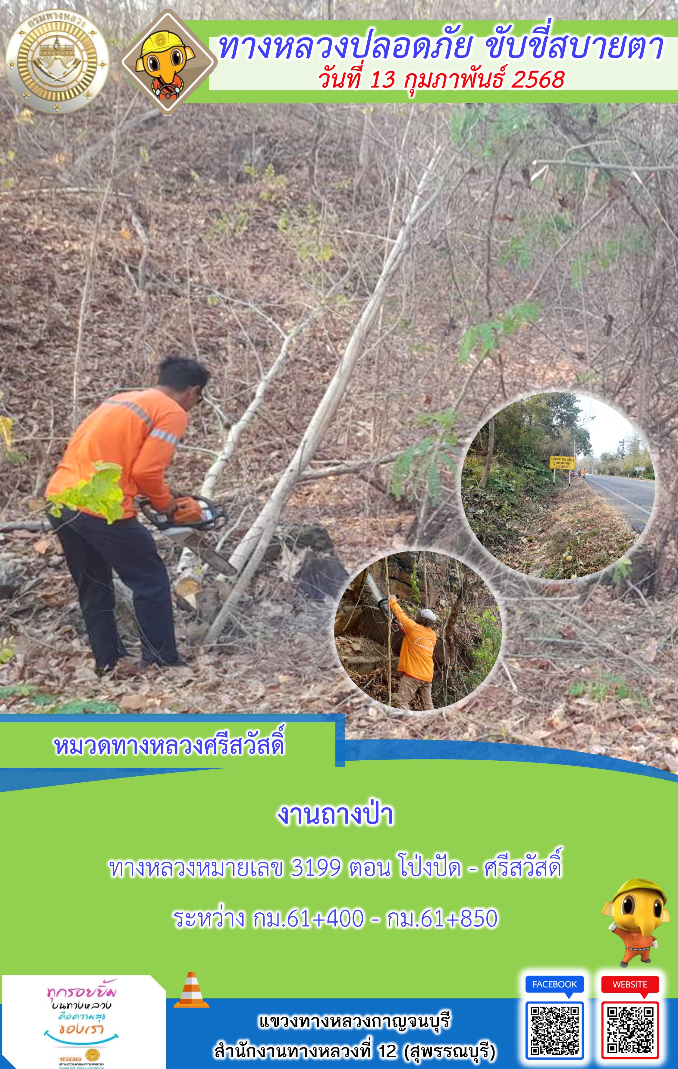 แขวงทางหลวงกาญจนบุรี โดยหมวดทางหลวงในสังกัด และงานอำนวยความปลอดภัยปฏิบัติงาน ประจำวันที่ 13 ก.พ. 68