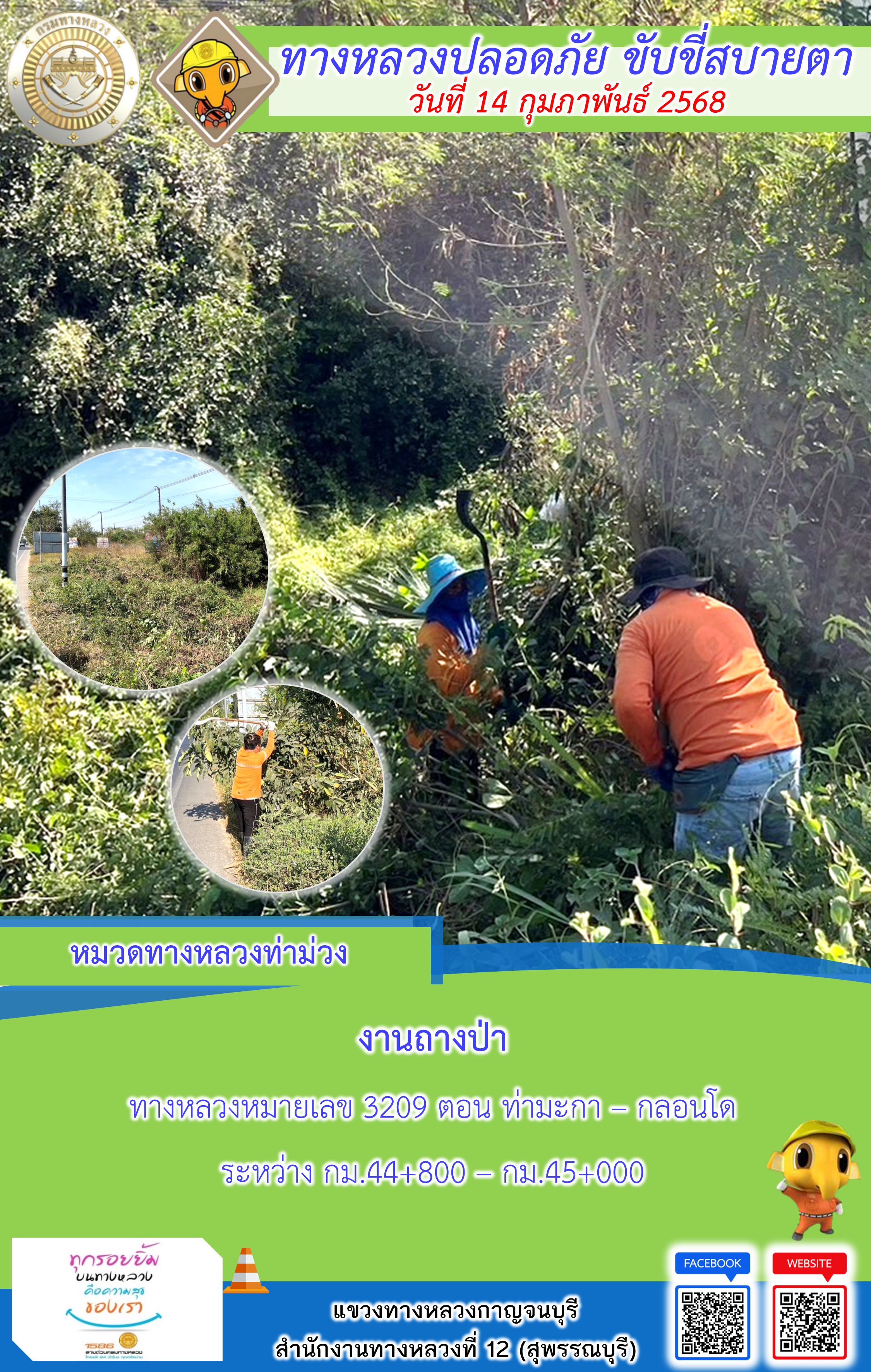 แขวงทางหลวงกาญจนบุรี โดยหมวดทางหลวงในสังกัด และงานอำนวยความปลอดภัยปฏิบัติงาน ประจำวันที่ 14 ก.พ. 68