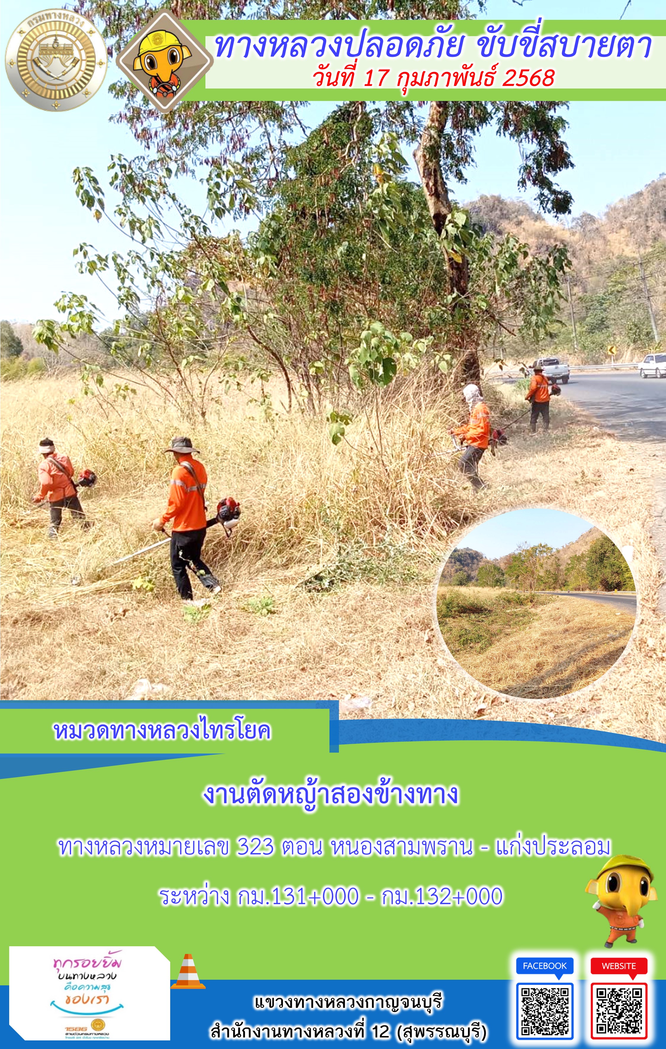 แขวงทางหลวงกาญจนบุรี โดยหมวดทางหลวงในสังกัด และงานอำนวยความปลอดภัยปฏิบัติงาน ประจำวันที่ 17 ก.พ. 68