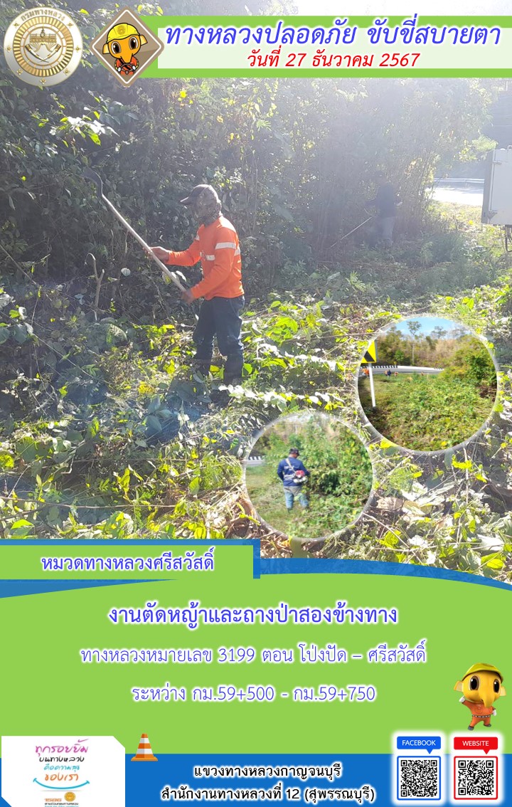 แขวงทางหลวงกาญจนบุรี โดยหมวดทางหลวงในสังกัด และงานอำนวยความปลอดภัยปฏิบัติงาน ประจำวันที่ 27 ธ.ค. 67