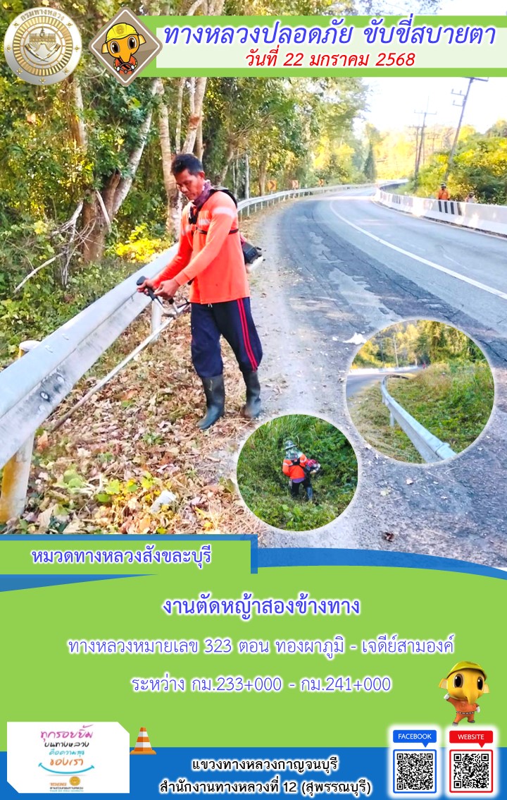 แขวงทางหลวงกาญจนบุรี โดยหมวดทางหลวงในสังกัด และงานอำนวยความปลอดภัยปฏิบัติงาน ประจำวันที่ 22 ม.ค. 68