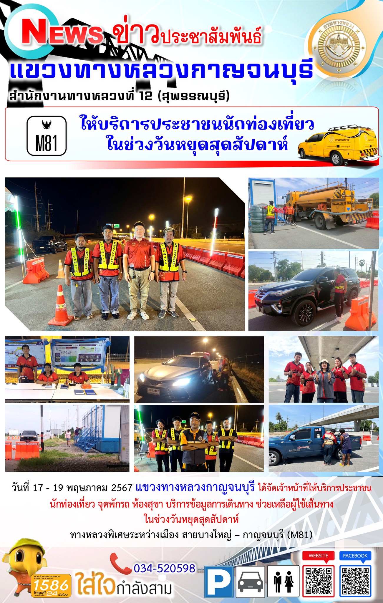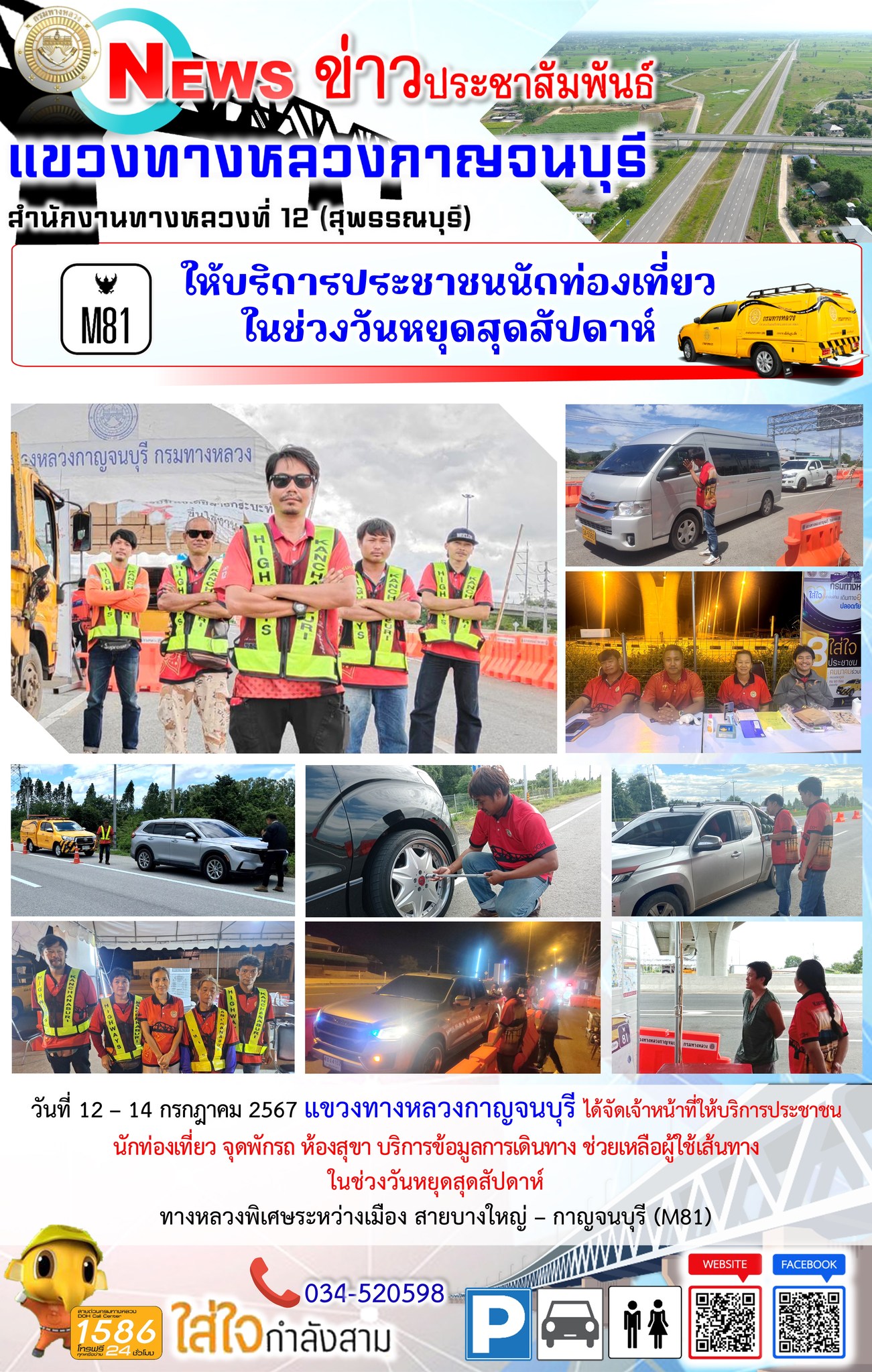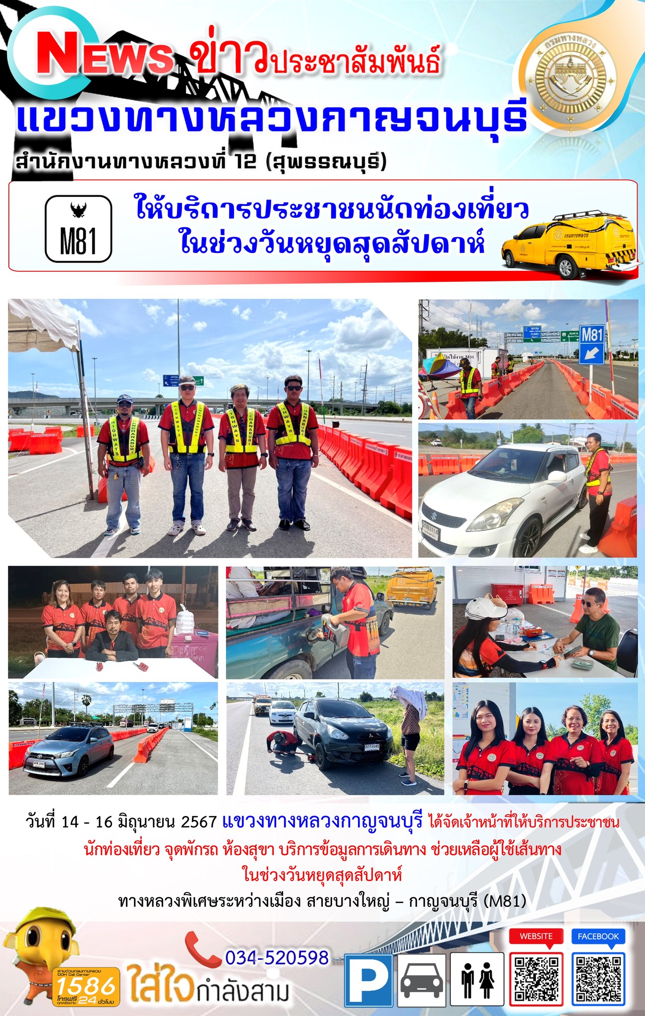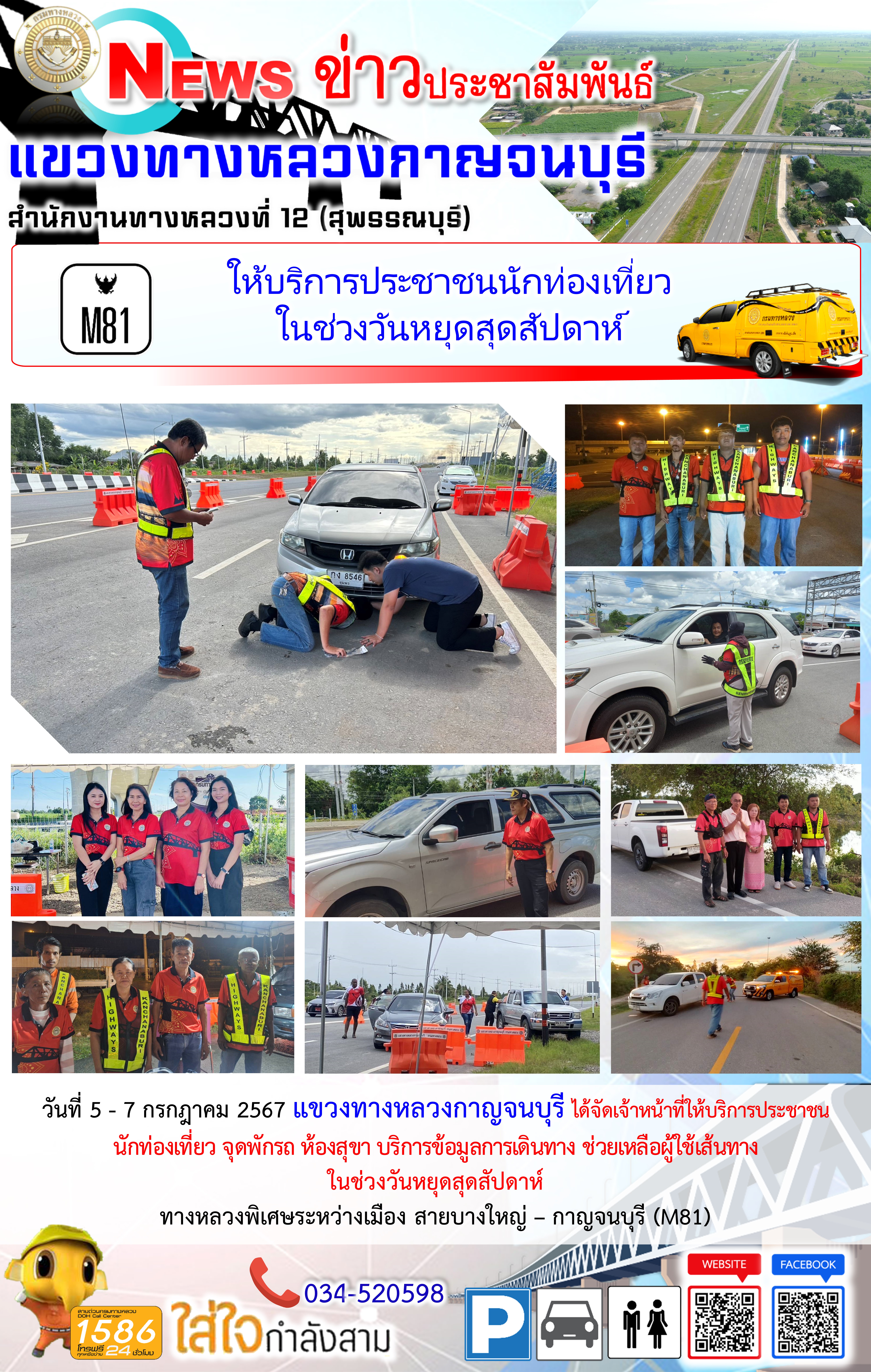 วันที่ 14 - 16 มิถุนายน 2567 แขวงทางหลวงกาญจนบุรี ได้จัดเจ้าหน้าที่ให้บริการประชาชน นักท่องเที่ยว จุดพักรถ ห้องสุขา บริการข้อมูลการเดินทาง ช่วยเหลือผู้ใช้เส้นทาง ในช่วงวันหยุดสุดสัปดาห์ ทางหลวงพิเศษระหว่างเมือง สายบางใหญ่ – กาญจนบุรี (M81)
