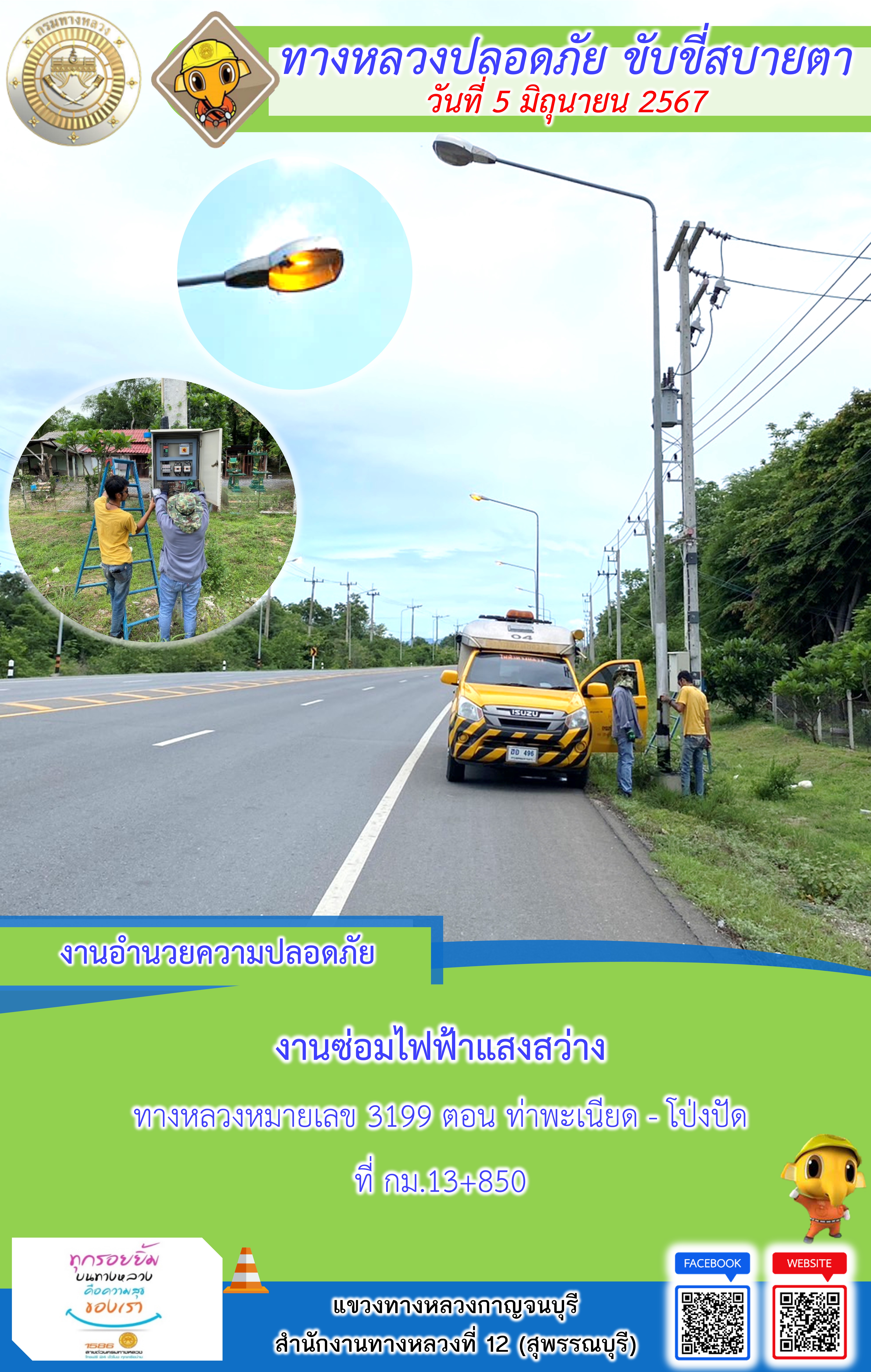 แขวงทางหลวงกาญจนบุรี โดยหมวดทางหลวงในสังกัด และงานอำนวยความปลอดภัยปฏิบัติงาน ประจำวันที่ 5 มิ.ย. 67