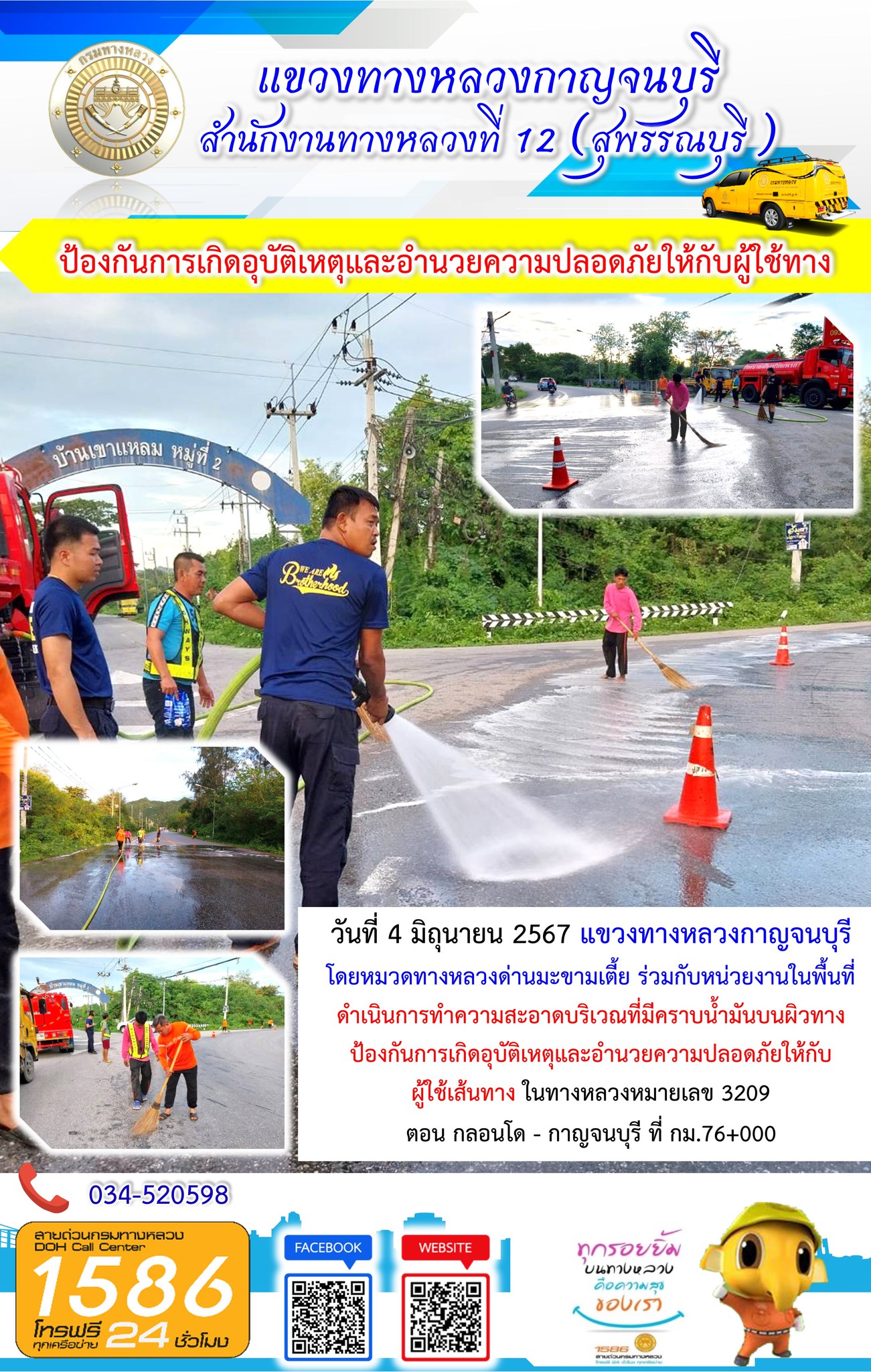 วันที่ 4 มิถุนายน 2567 แขวงทางหลวงกาญจนบุรี โดยหมวดทางหลวงด่านมะขามเตี้ย ร่วมกับหน่วยงานในพื้นที่ ดำเนินการทำความสะอาดบริเวณที่มีคราบน้ำมันบนผิวทาง ป้องกันการเกิดอุบัติเหตุและอำนวยความปลอดภัยให้กับผู้ใช้เส้นทาง ในทางหลวงหมายเลข 3209 ตอน กลอนโด - กาญจนบุรี? ที่ กม.76+000