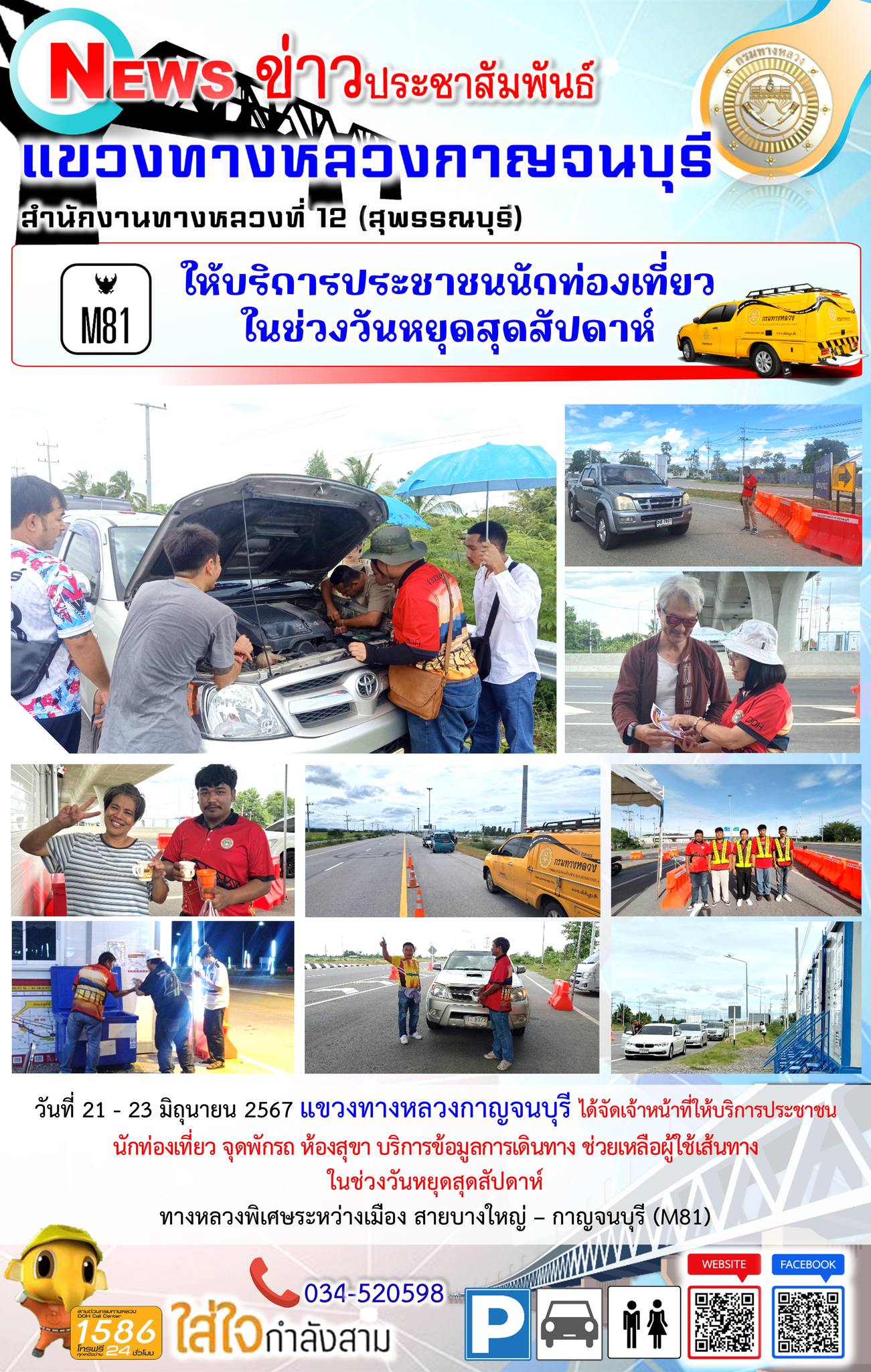 วันที่ 21 - 23 มิถุนายน 2567 แขวงทางหลวงกาญจนบุรี ได้จัดเจ้าหน้าที่ให้บริการประชาชน นักท่องเที่ยว จุดพักรถ ห้องสุขา บริการข้อมูลการเดินทาง ช่วยเหลือผู้ใช้เส้นทาง ในช่วงวันหยุดสุดสัปดาห์ ทางหลวงพิเศษระหว่างเมือง สายบางใหญ่ – กาญจนบุรี (M81)