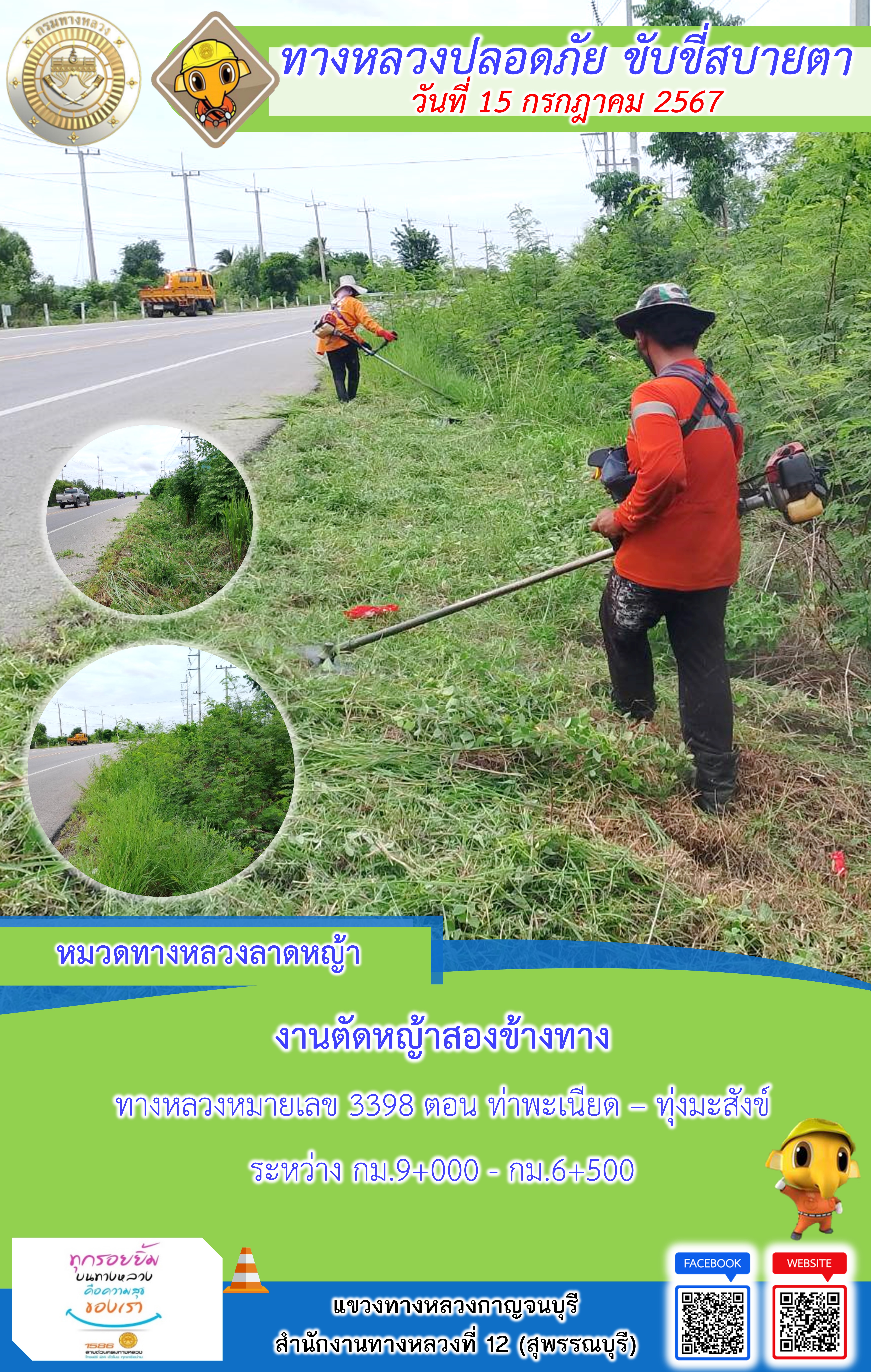 แขวงทางหลวงกาญจนบุรี โดยหมวดทางหลวงในสังกัด และงานอำนวยความปลอดภัยปฏิบัติงาน ประจำวันที่ 15 ก.ค. 67