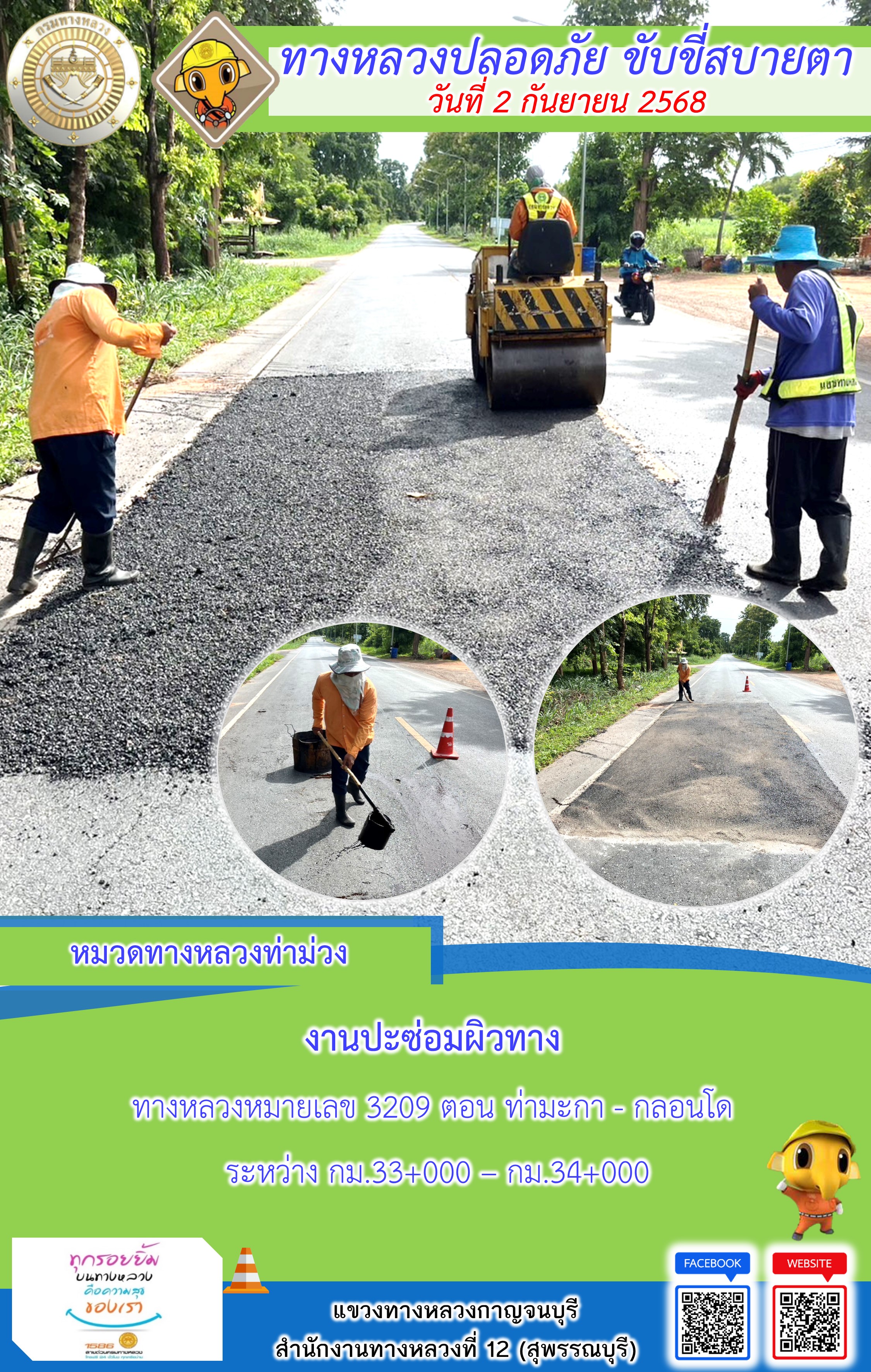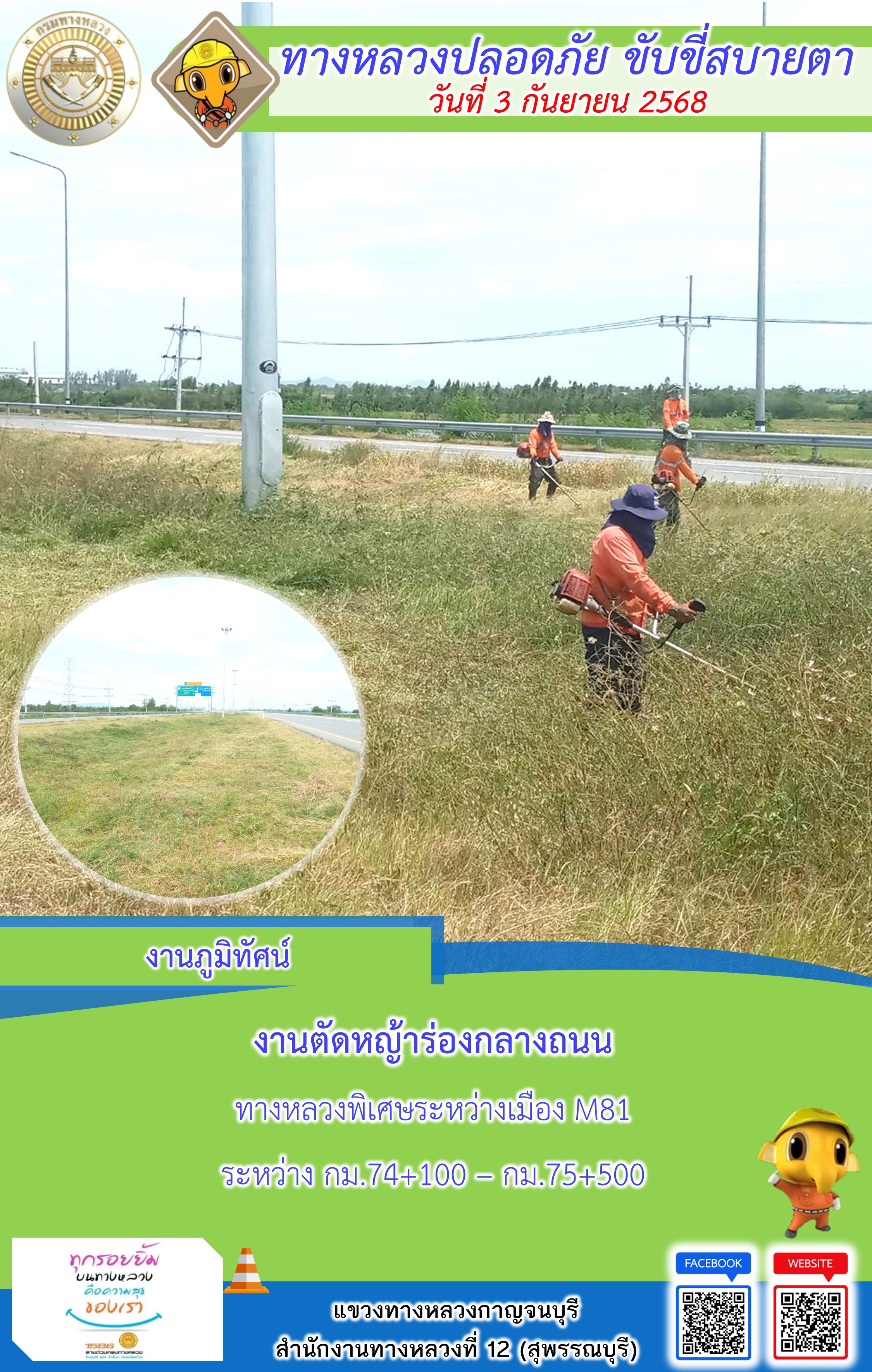 แขวงทางหลวงกาญจนบุรี โดยหมวดทางหลวงในสังกัด และงานอำนวยความปลอดภัยปฏิบัติงาน ประจำวันที่ 3 ก.ย. 68