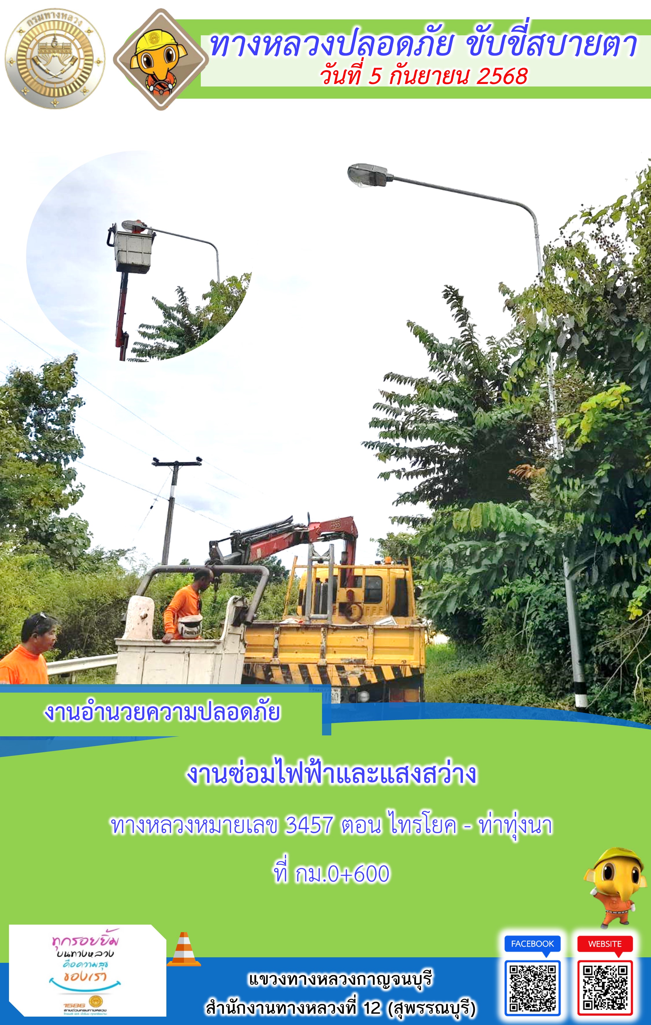แขวงทางหลวงกาญจนบุรี โดยหมวดทางหลวงในสังกัด และงานอำนวยความปลอดภัยปฏิบัติงาน ประจำวันที่ 5 ก.ย. 68