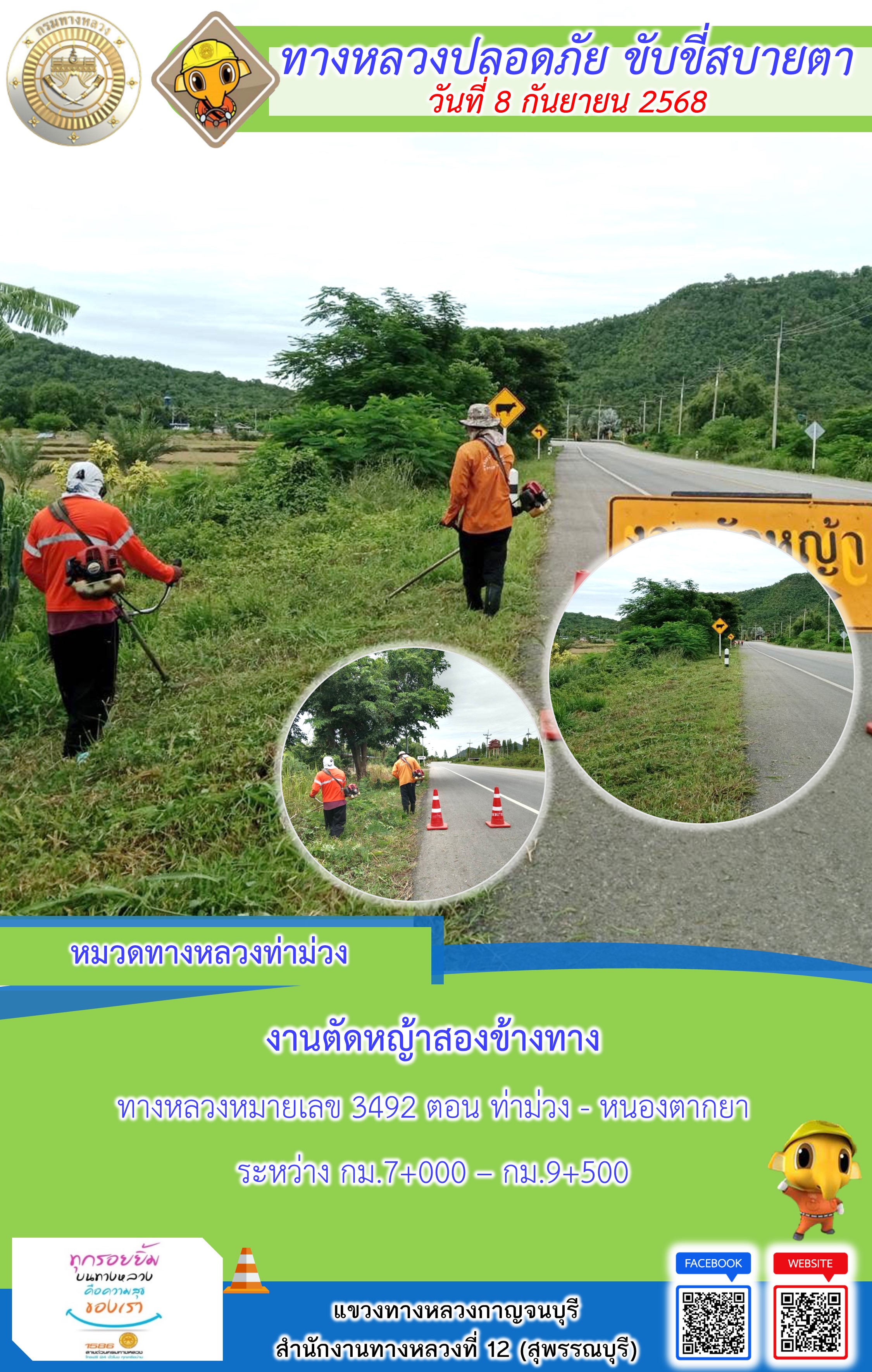 แขวงทางหลวงกาญจนบุรี โดยหมวดทางหลวงในสังกัด และงานอำนวยความปลอดภัยปฏิบัติงาน ประจำวันที่ 8 ก.ย. 68