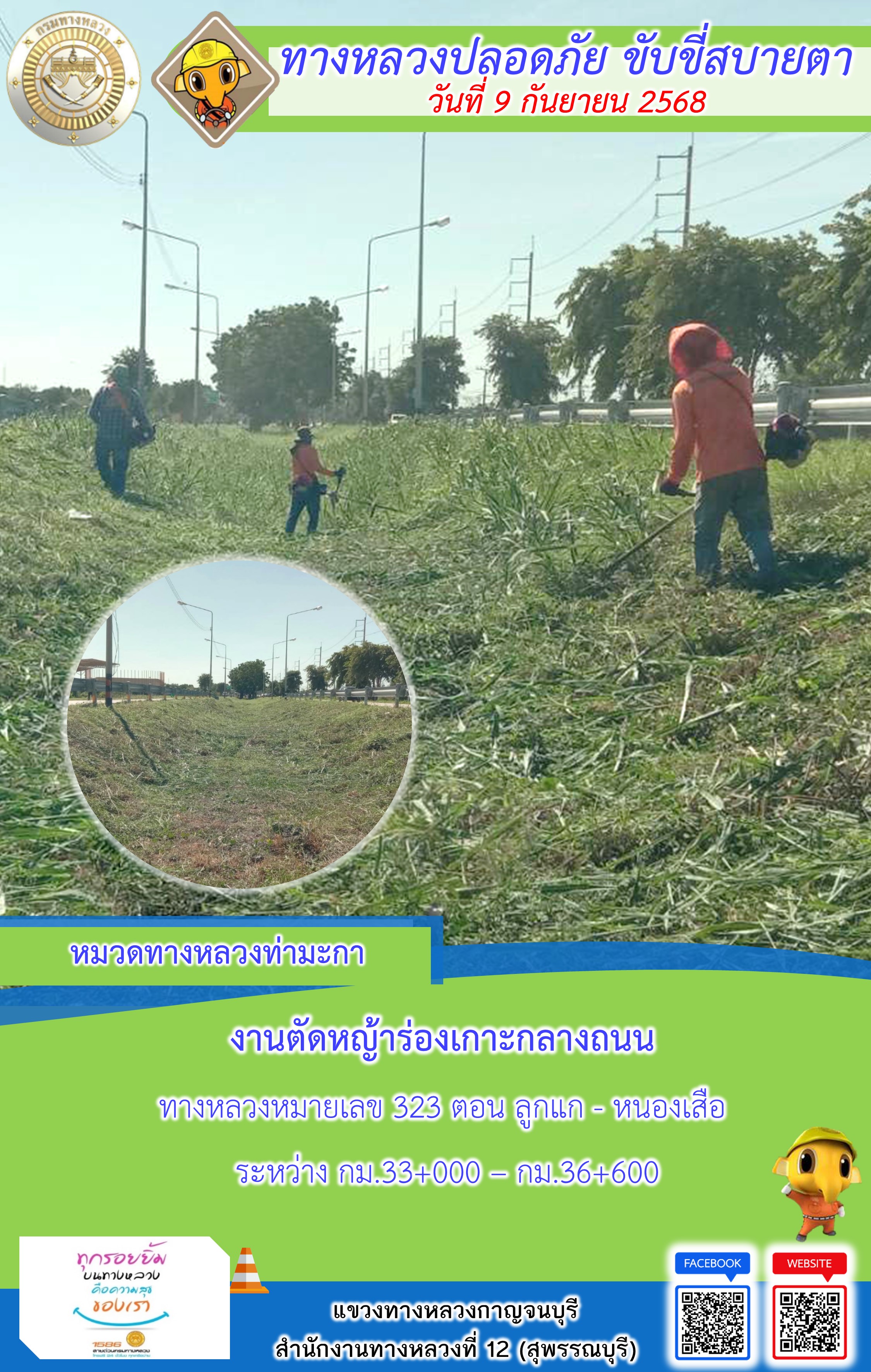 แขวงทางหลวงกาญจนบุรี โดยหมวดทางหลวงในสังกัด และงานอำนวยความปลอดภัยปฏิบัติงาน ประจำวันที่ 9 ก.ย. 68