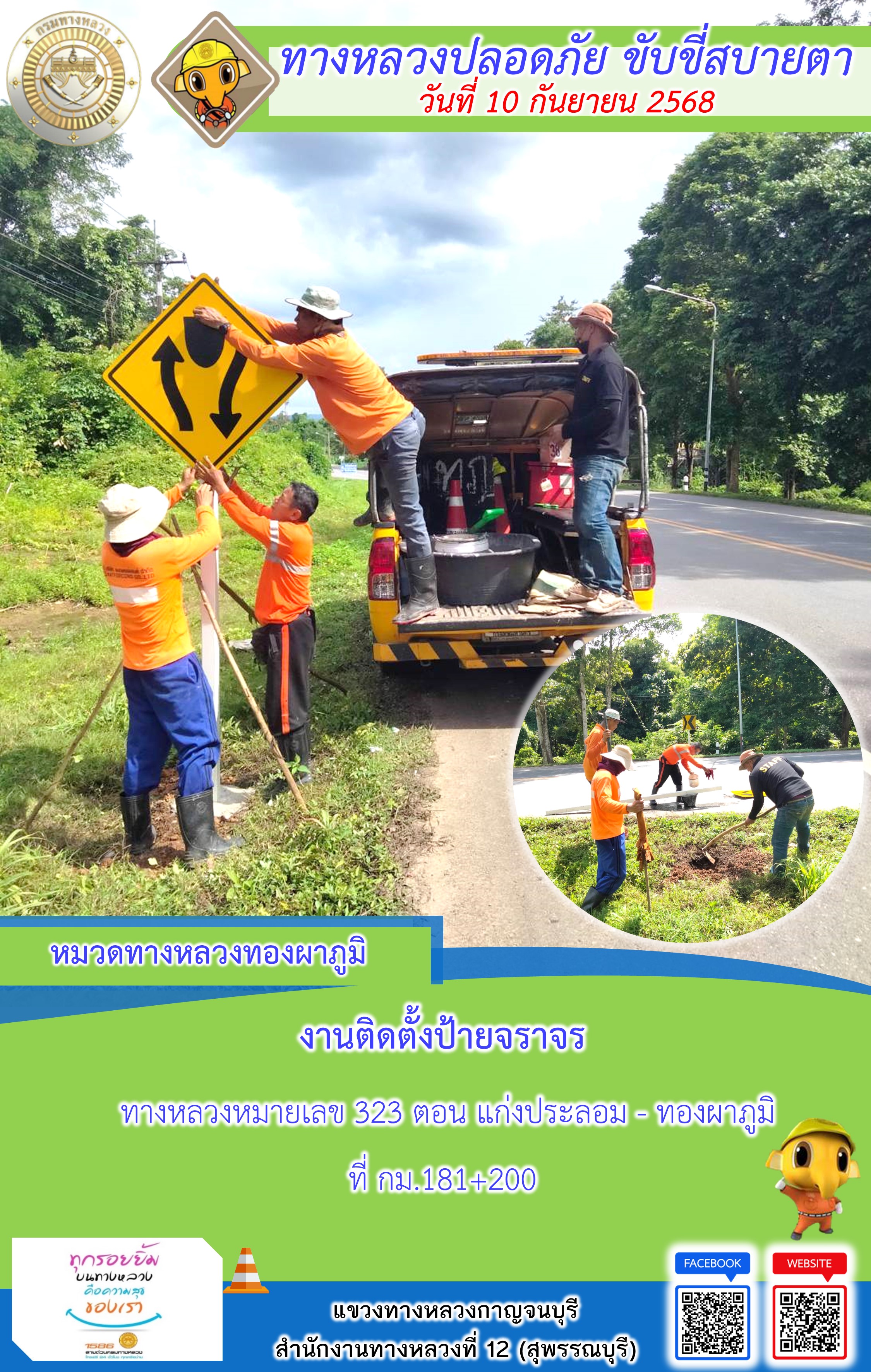 แขวงทางหลวงกาญจนบุรี โดยหมวดทางหลวงในสังกัด และงานอำนวยความปลอดภัยปฏิบัติงาน ประจำวันที่ 10 ก.ย. 68