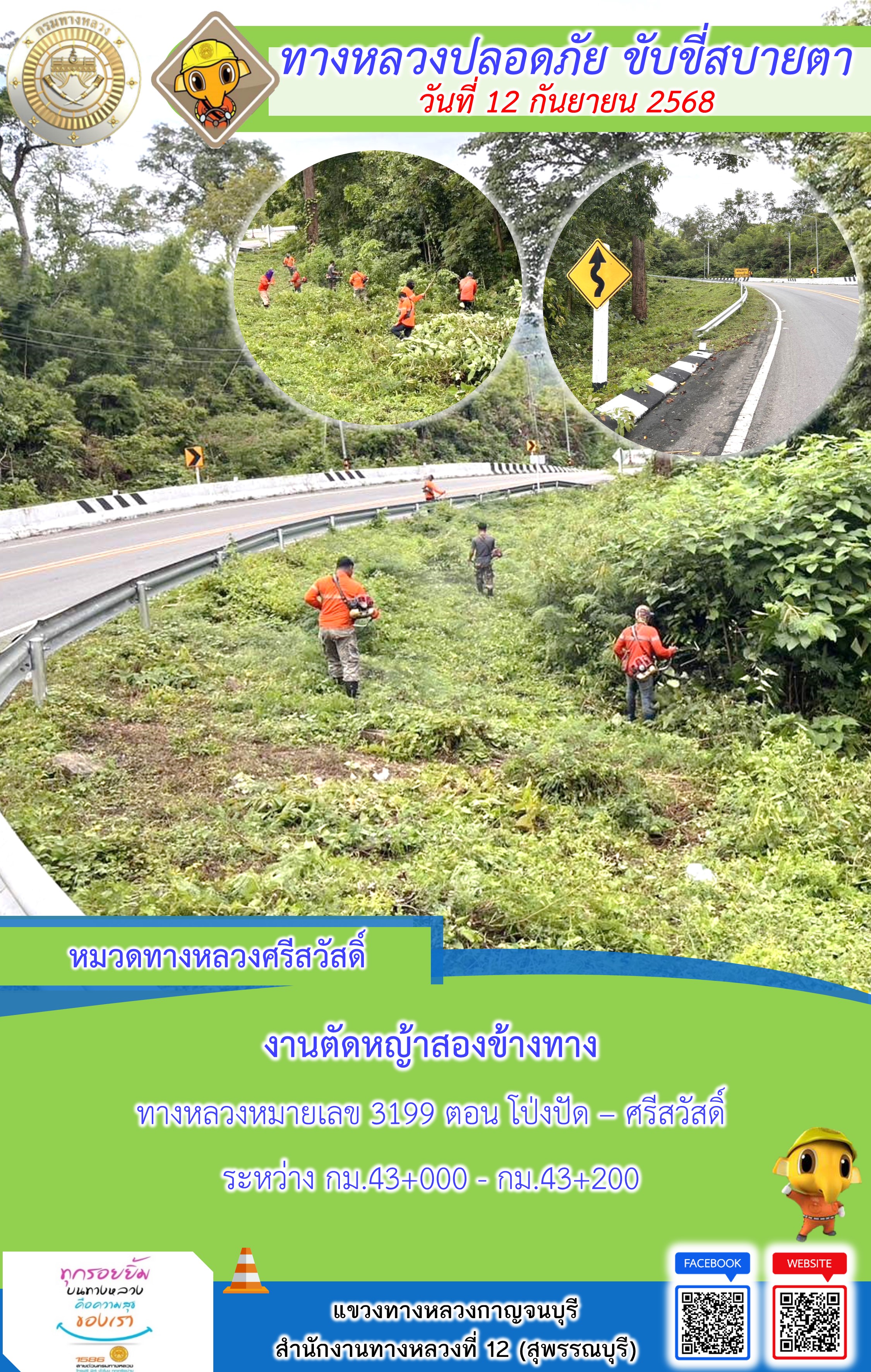 แขวงทางหลวงกาญจนบุรี โดยหมวดทางหลวงในสังกัด และงานอำนวยความปลอดภัยปฏิบัติงาน ประจำวันที่ 12 ก.ย. 68