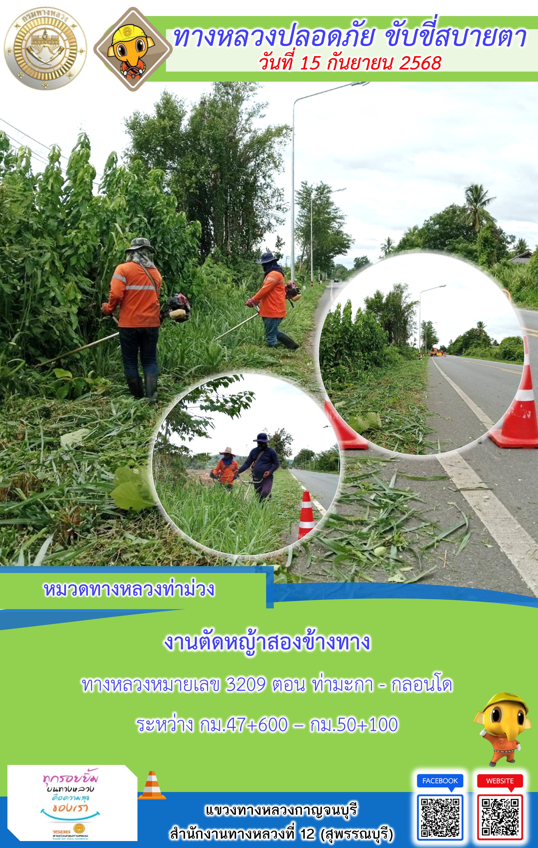แขวงทางหลวงกาญจนบุรี โดยหมวดทางหลวงในสังกัด และงานอำนวยความปลอดภัยปฏิบัติงาน ประจำวันที่ 15 ก.ย. 68