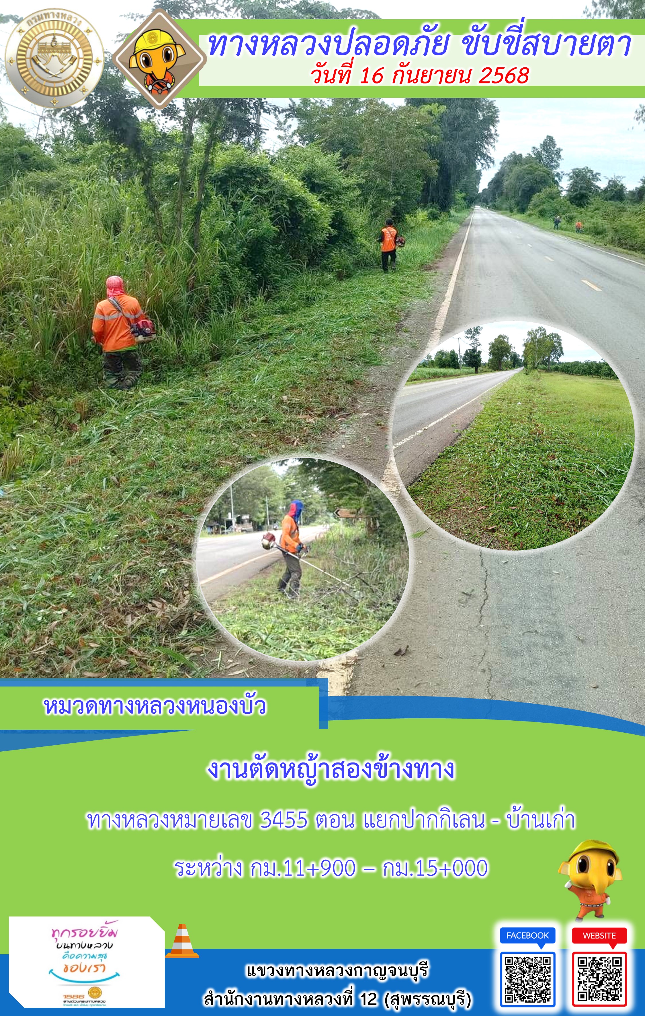แขวงทางหลวงกาญจนบุรี โดยหมวดทางหลวงในสังกัด และงานอำนวยความปลอดภัยปฏิบัติงาน ประจำวันที่ 16 ก.ย. 68