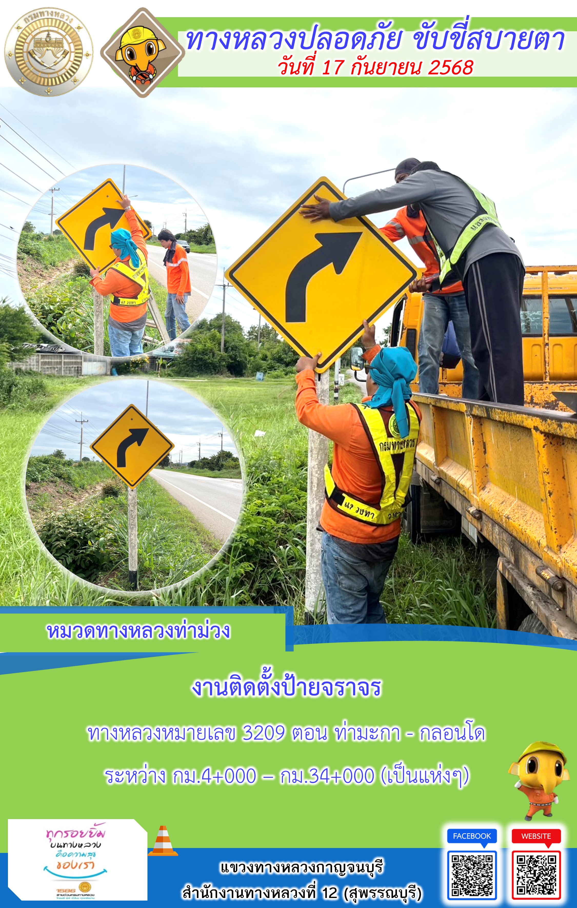 แขวงทางหลวงกาญจนบุรี โดยหมวดทางหลวงในสังกัด และงานอำนวยความปลอดภัยปฏิบัติงาน ประจำวันที่ 17 ก.ย. 68