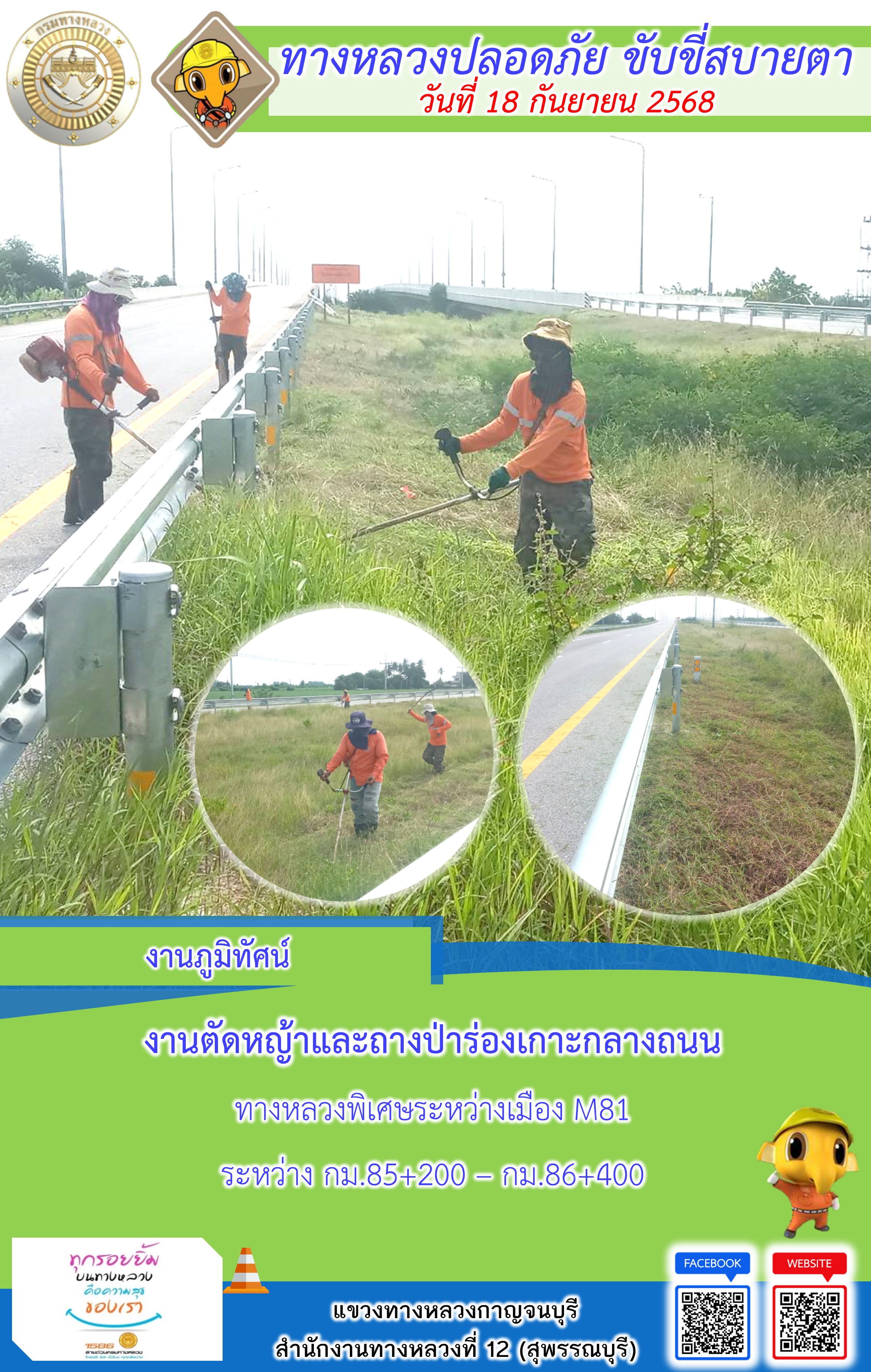 แขวงทางหลวงกาญจนบุรี โดยหมวดทางหลวงในสังกัด และงานอำนวยความปลอดภัยปฏิบัติงาน ประจำวันที่ 18 ก.ย. 68